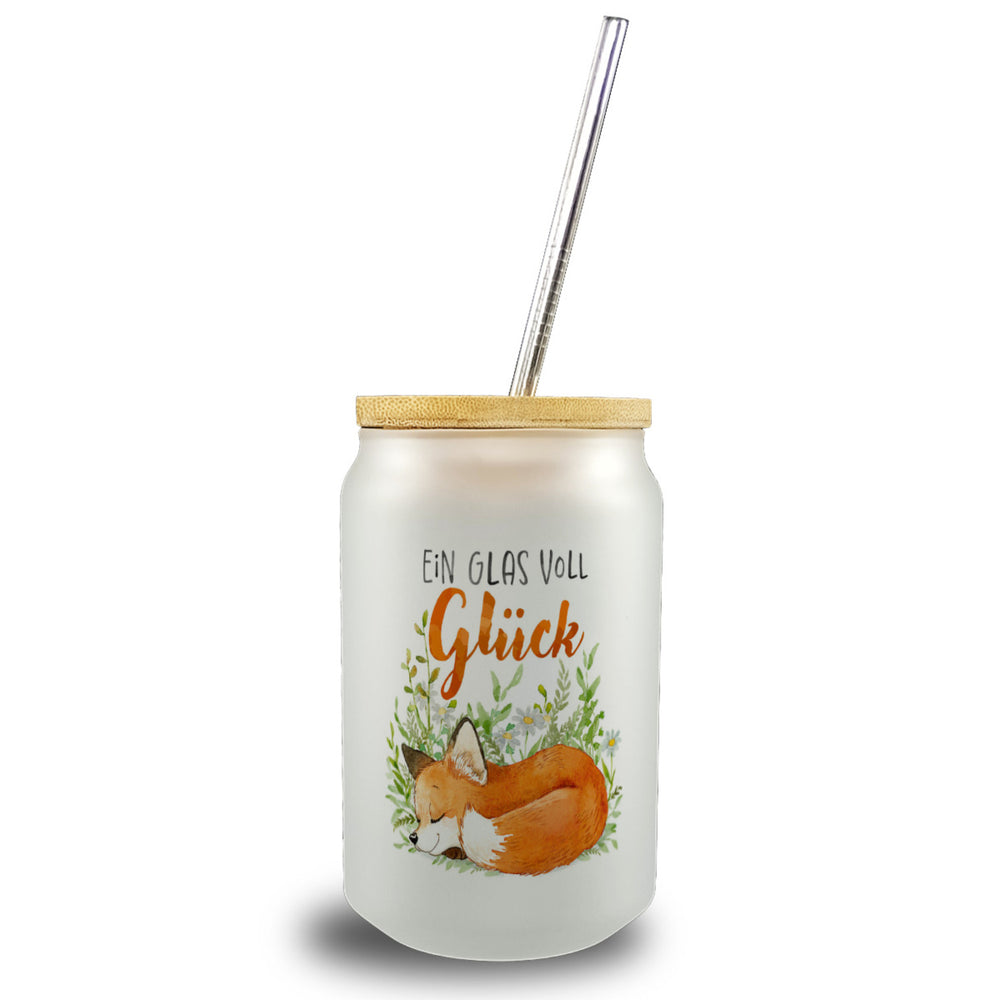 Fuchs Trinkglas mit Bambusdeckel mit Spruch Ein Glas voll Glück