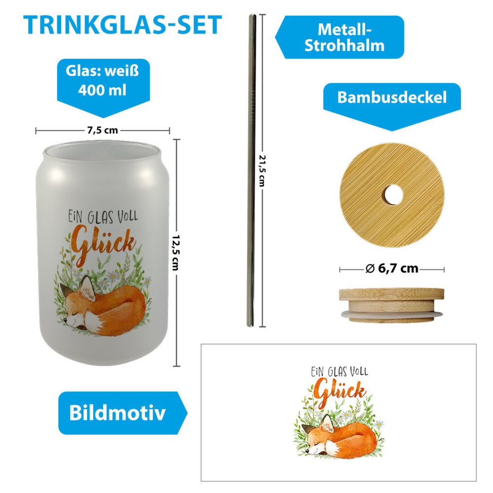 - Lieferumfang: 1x Fuchs Trinkglas mit Bambusdeckel mit Spruch Ein Glas voll Glück