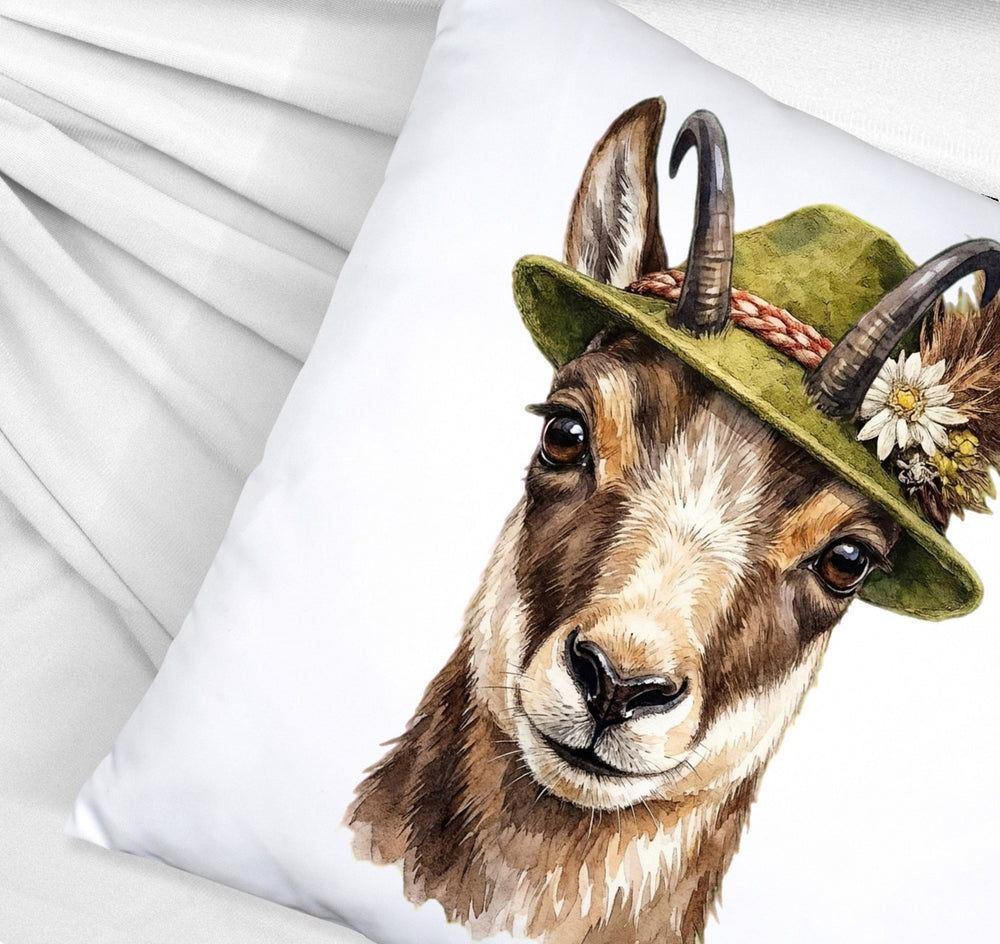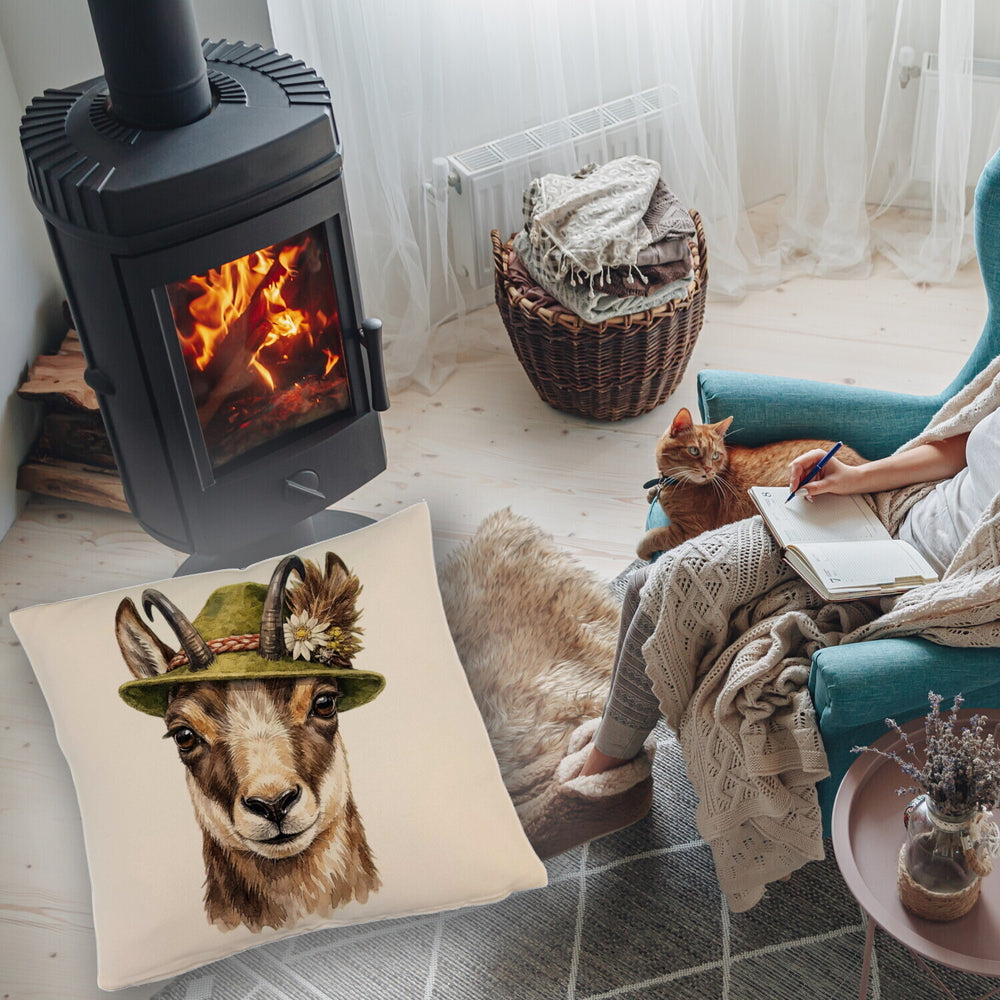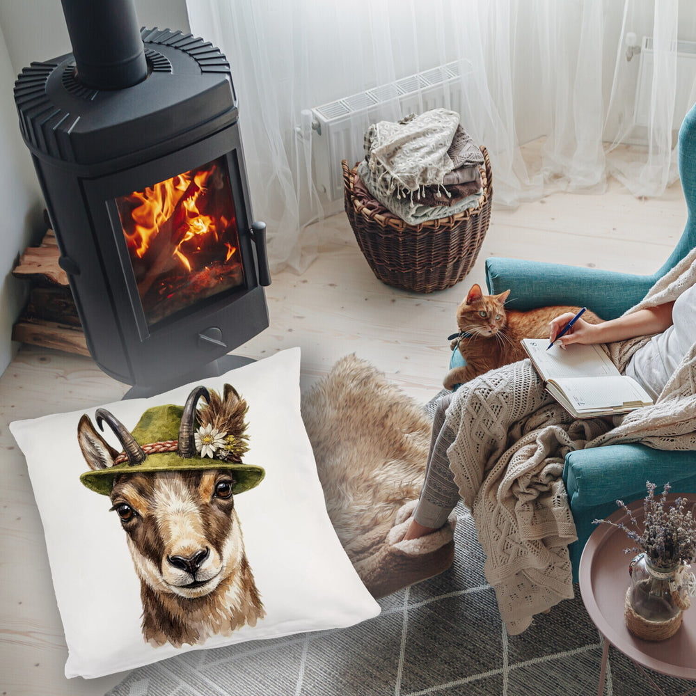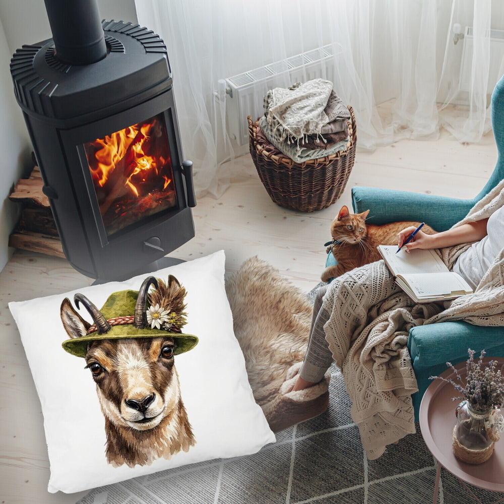 - Dieses außergewöhnliche Kissen zeigt ein beeindruckendes Aquarellporträt einer Gämse, elegant mit einem traditionellen Trachtenhut geschmückt. Der Hut erinnert an die alpine Schönheit des Zillertals und Tirols. Ein witziges Dekokissen, das Kunst und Tradition kombiniert und jeden Raum mit einem Hauch von Bergen und Natur verschönert.