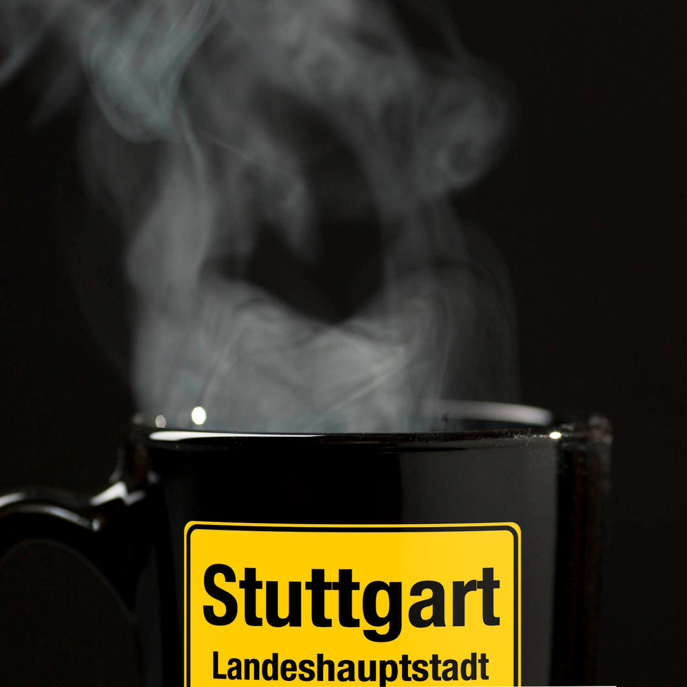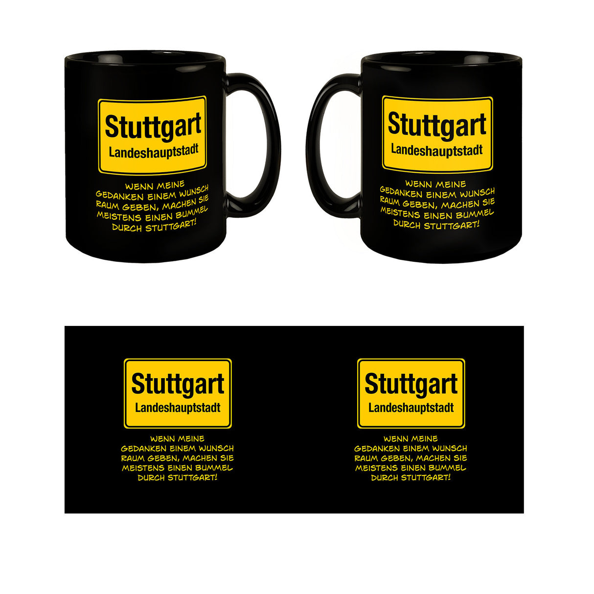 Die schwarze Tasse kommt mit einem gelben Ortsschild-Motiv, das Stuttgart, die Landeshauptstadt, anzeigt. Der humorvolle Spruch "Wenn meine Gedanken einem Wunsch Raum geben, machen sie meistens einen Bummel durch Stuttgart!" macht sie zum echten H Hinweise: Fassungsvermögen: ca. 300ml