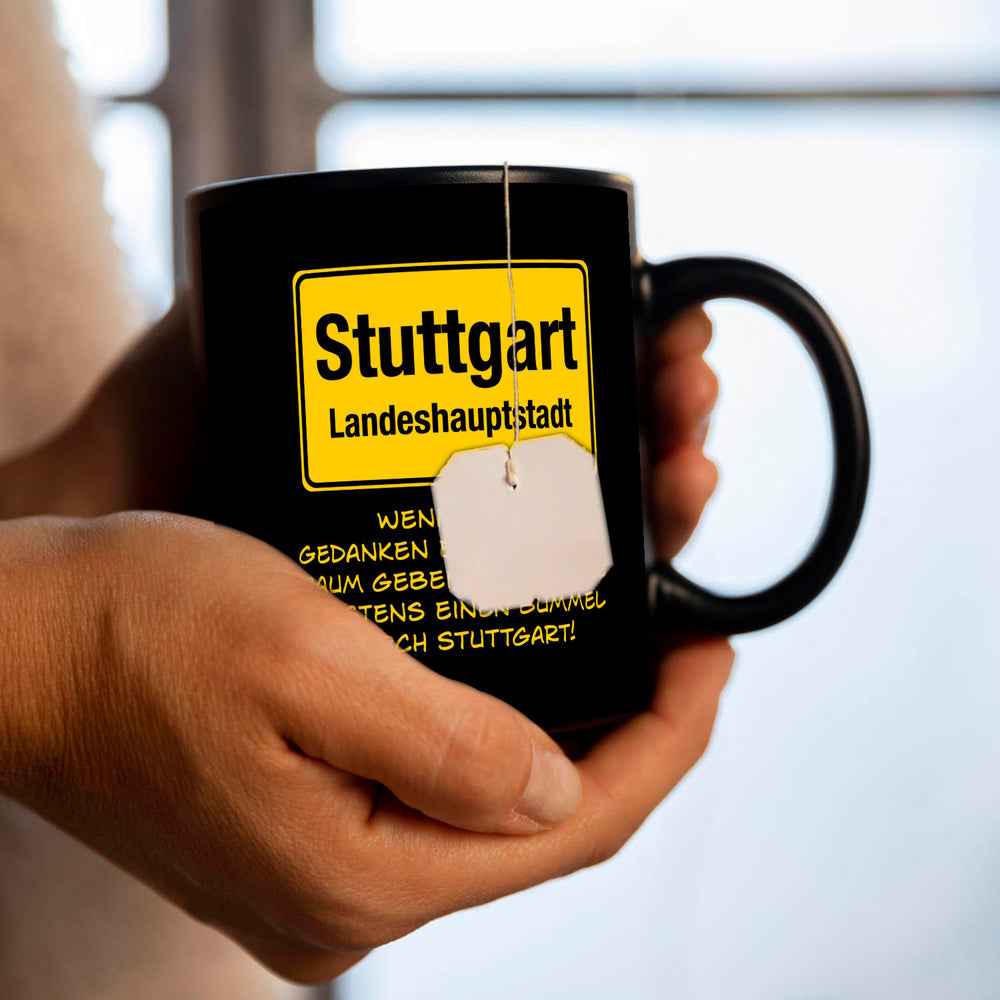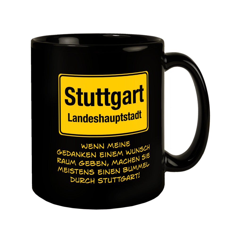• Die schwarze Tasse kommt mit einem gelben Ortsschild-Motiv, das Stuttgart, die Landeshauptstadt, anzeigt. Der humorvolle Spruch "Wenn meine Gedanken einem Wunsch Raum geben, machen sie meistens einen Bummel durch Stuttgart!" macht sie zum echten Hingucker. Ein originelles und ausgefallenes Design, perfekt für Stuttgart-Fans.