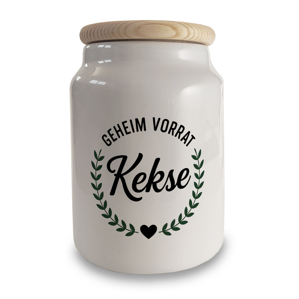 Die Geheimvorrat Kekse Dose ist eine elegante, runde Keksdose mit einem stilvollen Logo-Design. Auf einem weißen Hintergrund hebt sich der Schriftzug "GEHEIM VORRAT" in großen schwarzen Buchstaben ab. Im Zentrum steht "Kekse" in geschwunge Hinweise: Material: Keramik und Holz / Volumen 650 ml