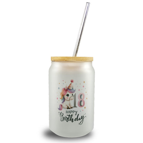 18. Geburtstag mit niedlichem Pferd Trinkglas mit Bambusdeckel mit Spruch Happy Birthday 18