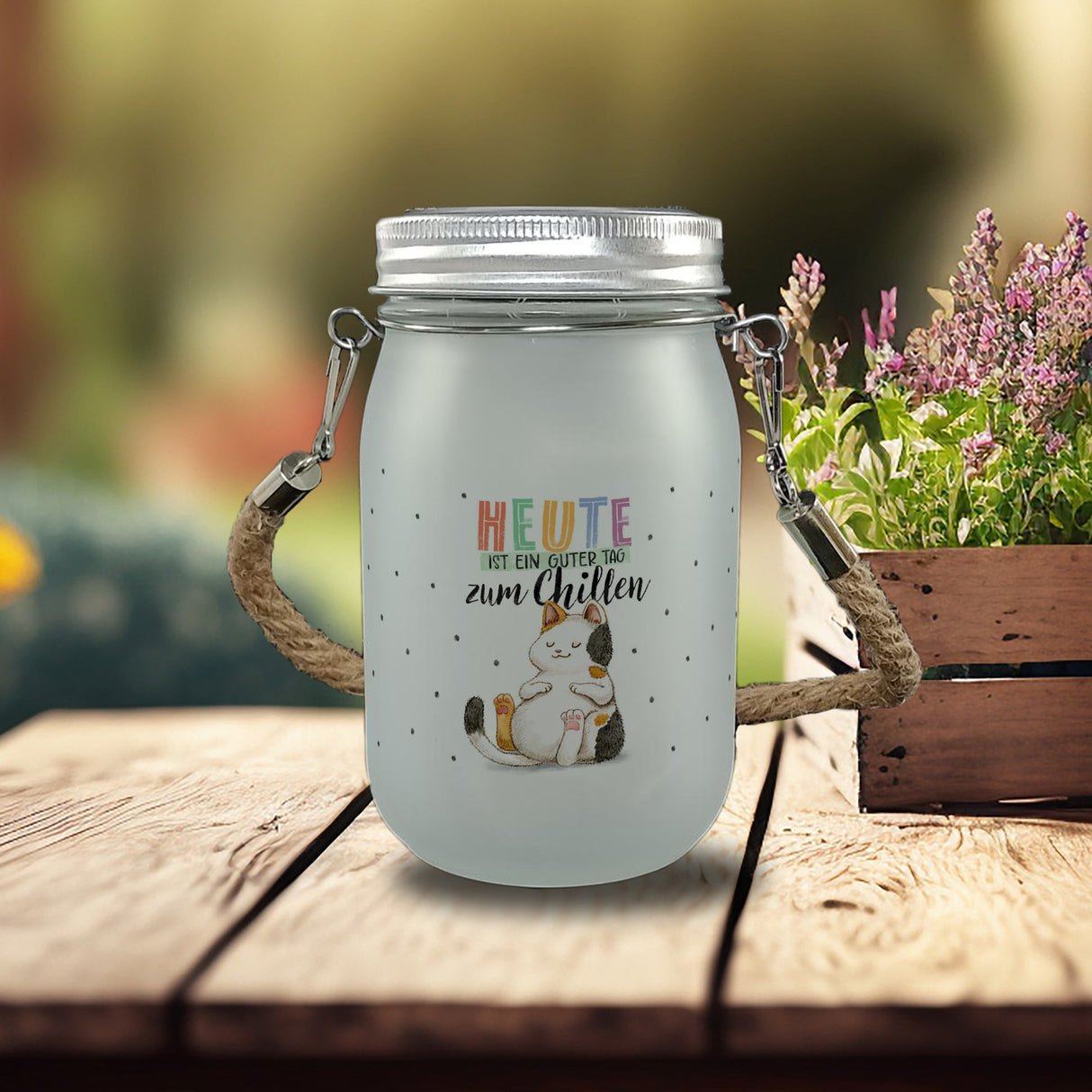 - Das Solarlicht ist ein wahrer Blickfang! Eine gemütlich chillende Glückskatze, die das süße Leben in vollen Zügen genießt, ziert das Dekolicht. Die nostalgische Optik des Einmachglases mit Solar Deckel und Strickhenkel verleiht ihm einen besonderen Charme. Ein Must-Have für jeden Katzenliebhaber und perfekt, um jedem Raum eine gemütliche Atmosphäre zu verleihen.