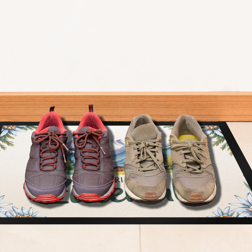 - Diese Fußmatte ist eine Hommage an das wunderschöne Zillertal und beeindruckt mit einem Aquarellmotiv von schneebedeckten Bergen und einem gemütlichen Holzchalet. Die sanften Blau- und Lavendeltöne der Berge harmonieren perfekt mit den warmen Gelb- und Rottönen des Chalets. Zarte Kiefern in Grün vervollständigen die idyllische Szene.