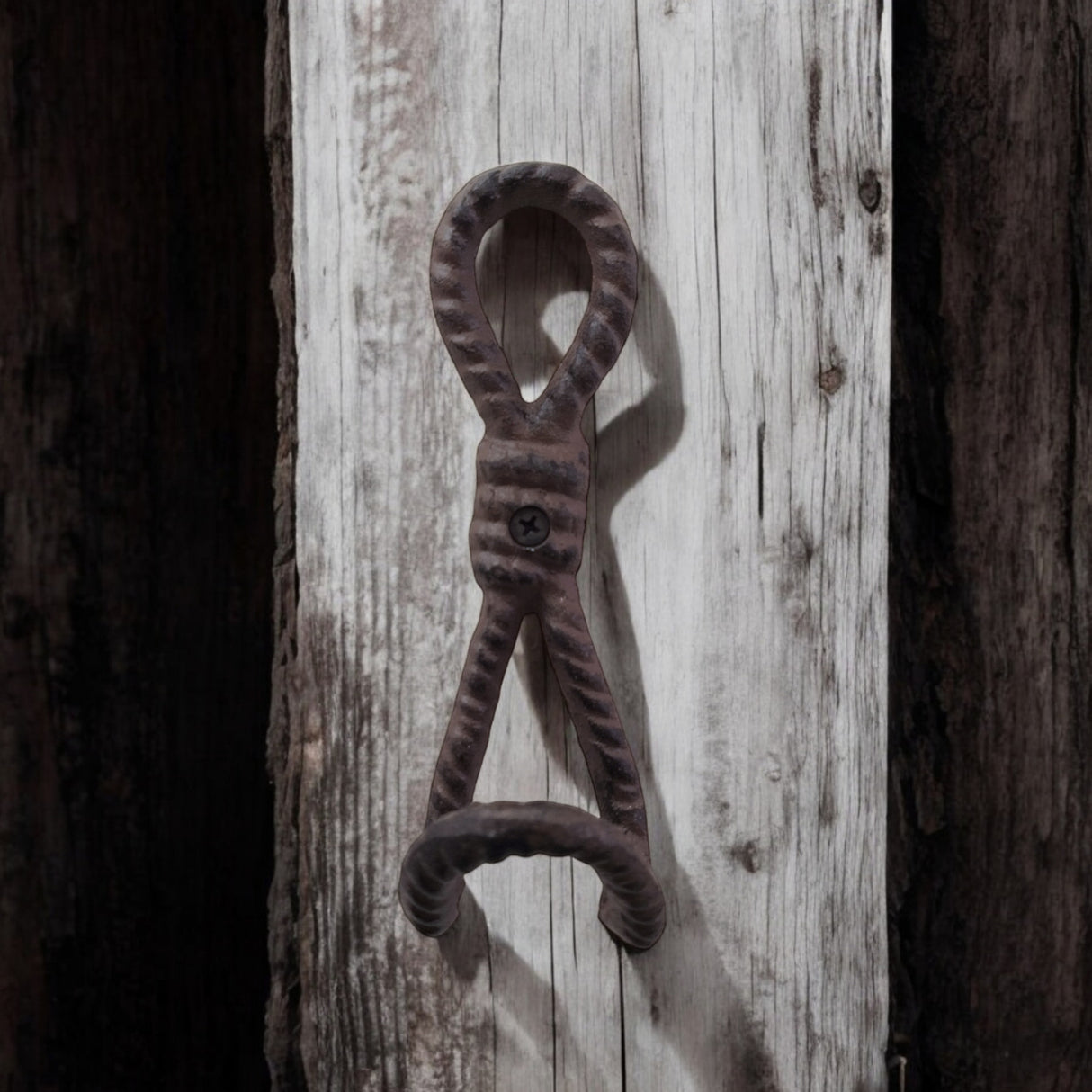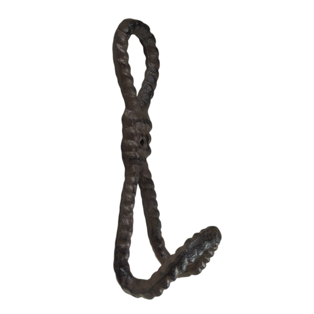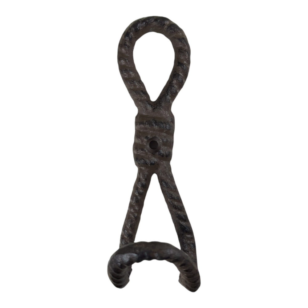- Dieses rustikale Schmuckstück aus Gusseisen besticht durch sein Knoten-Design, das wie ein echtes Seil wirkt. Mit einer großen Schlaufe zum Aufhängen und einem Loch zur Befestigung, bietet es eine robuste und stilvolle Lösung für deine Wanddeko.