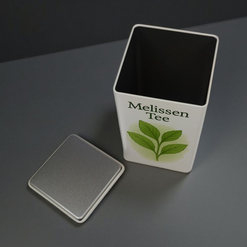 - Unsere "Grüne Ruhe Melissen Tee Dose" ist ein echter Hingucker! Die Metalldose ist mit liebevoll gestalteten botanischen Illustrationen von Melisseblättern bedruckt. Sie fasst 900 ml und der charmante Spruch "Melissen Tee" macht sie zu einem stilvollen Aufbewahrungsort für Ihre liebsten Teekräuter.