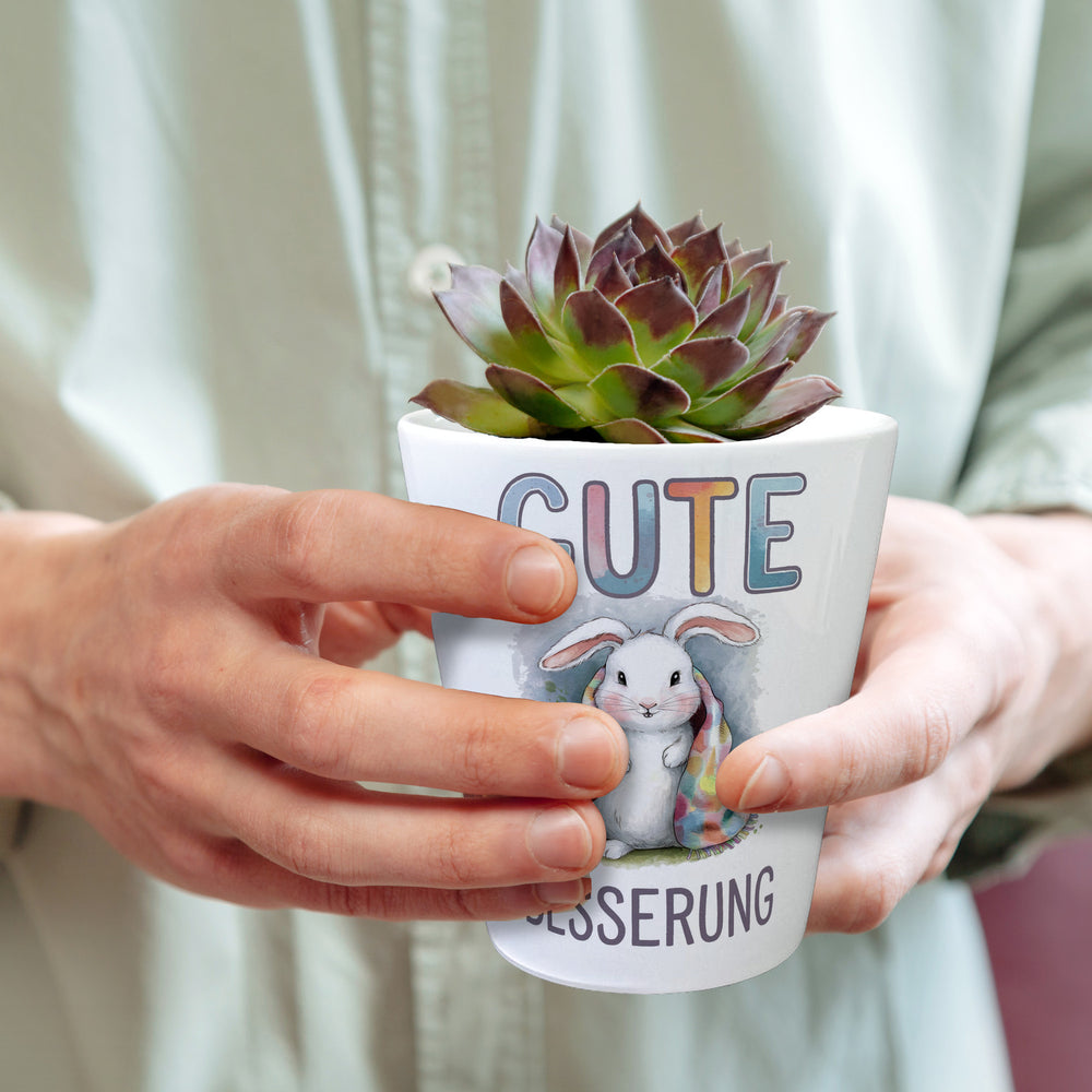 - Erleben Sie das süßeste Kaninchen aller Zeiten! Dieser charmante Blumentopf zeigt ein niedliches, weißes Kaninchen, eingehüllt in eine farbenfrohe Decke. Mit seinem künstlerischen aquarellartigen Hintergrund und dem fröhlichen "GUTE BESSERUNG"-Schriftzug ist er ein echter Hingucker und bringt Farbe und Freude in jeden Raum.