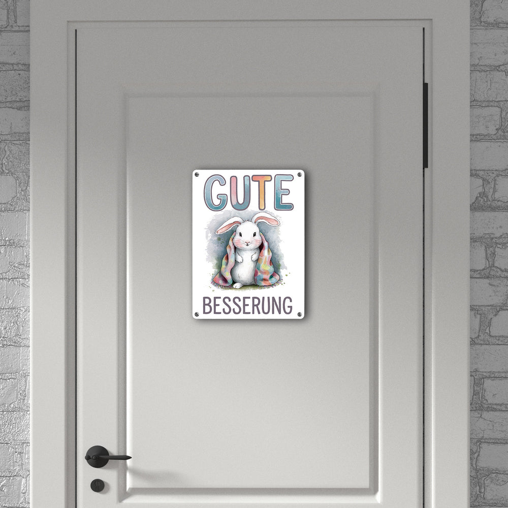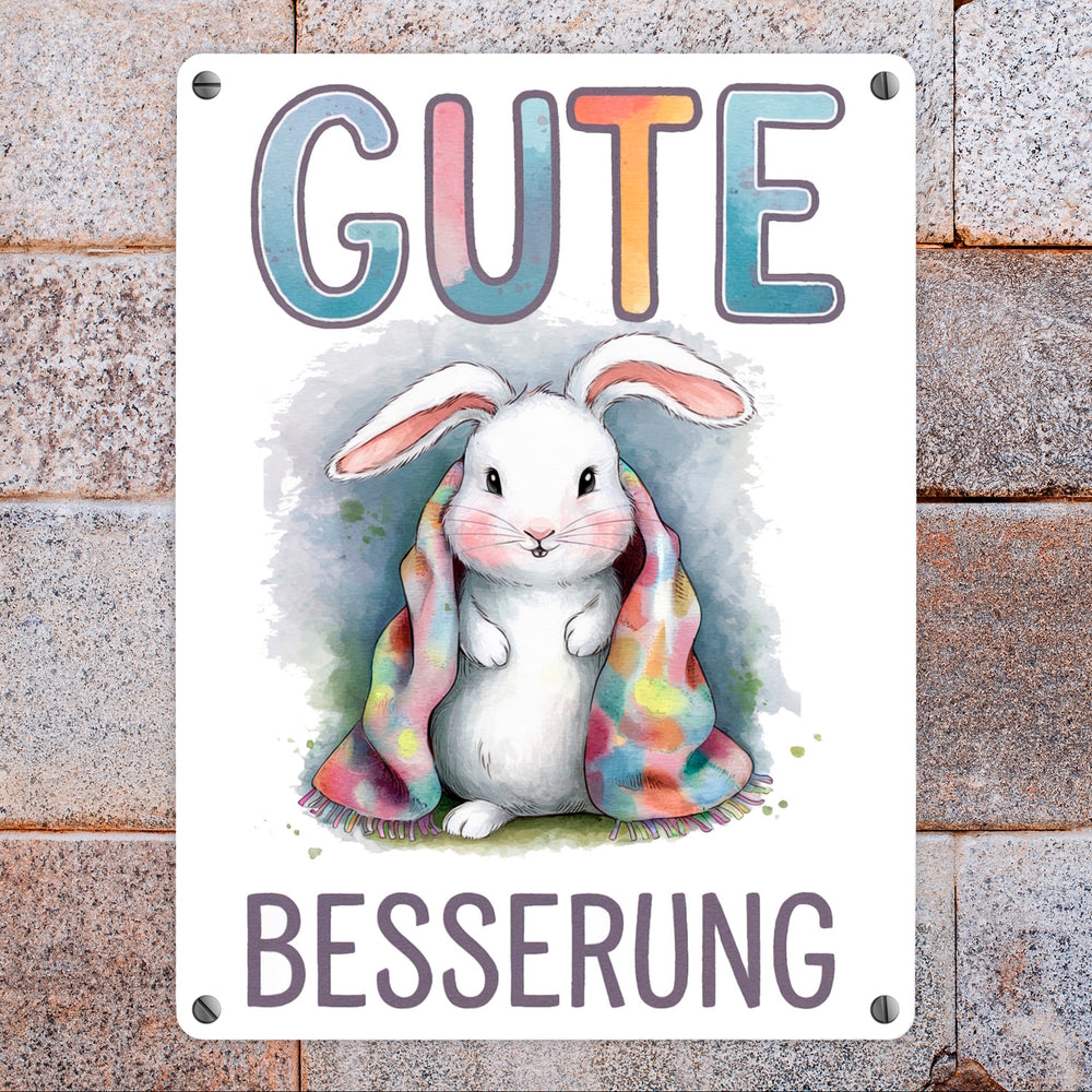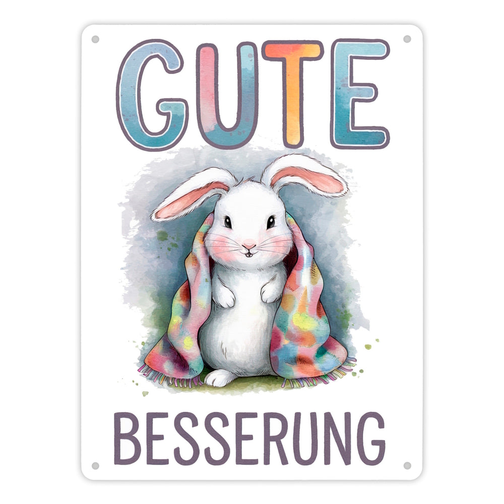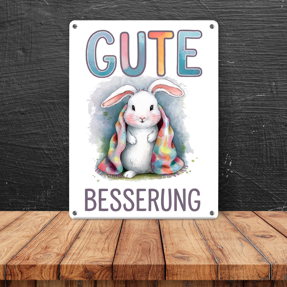Gute Besserung Metallschild in 15x20 cm - Weißes Kaninchen in einer Decke