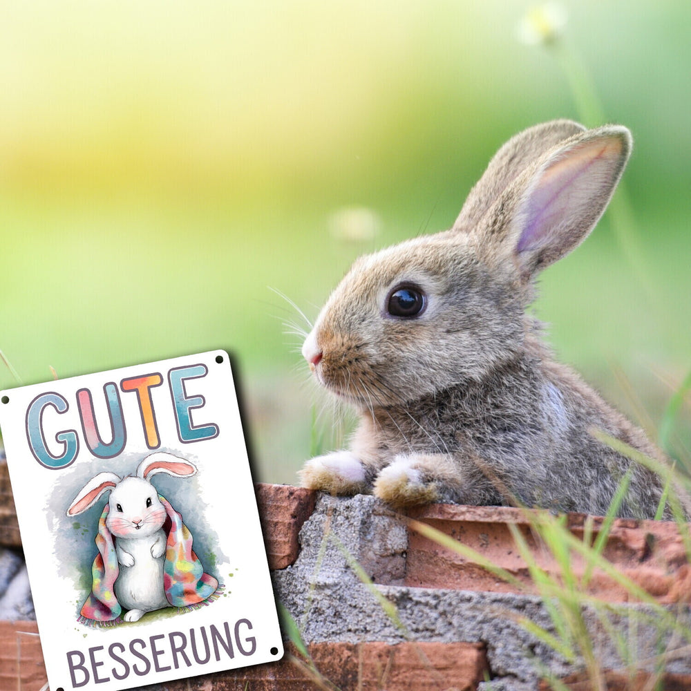 - 1x Gute Besserung Metallschild in 15x20 cm - Weißes Kaninchen in einer Decke in der gewählten Größe