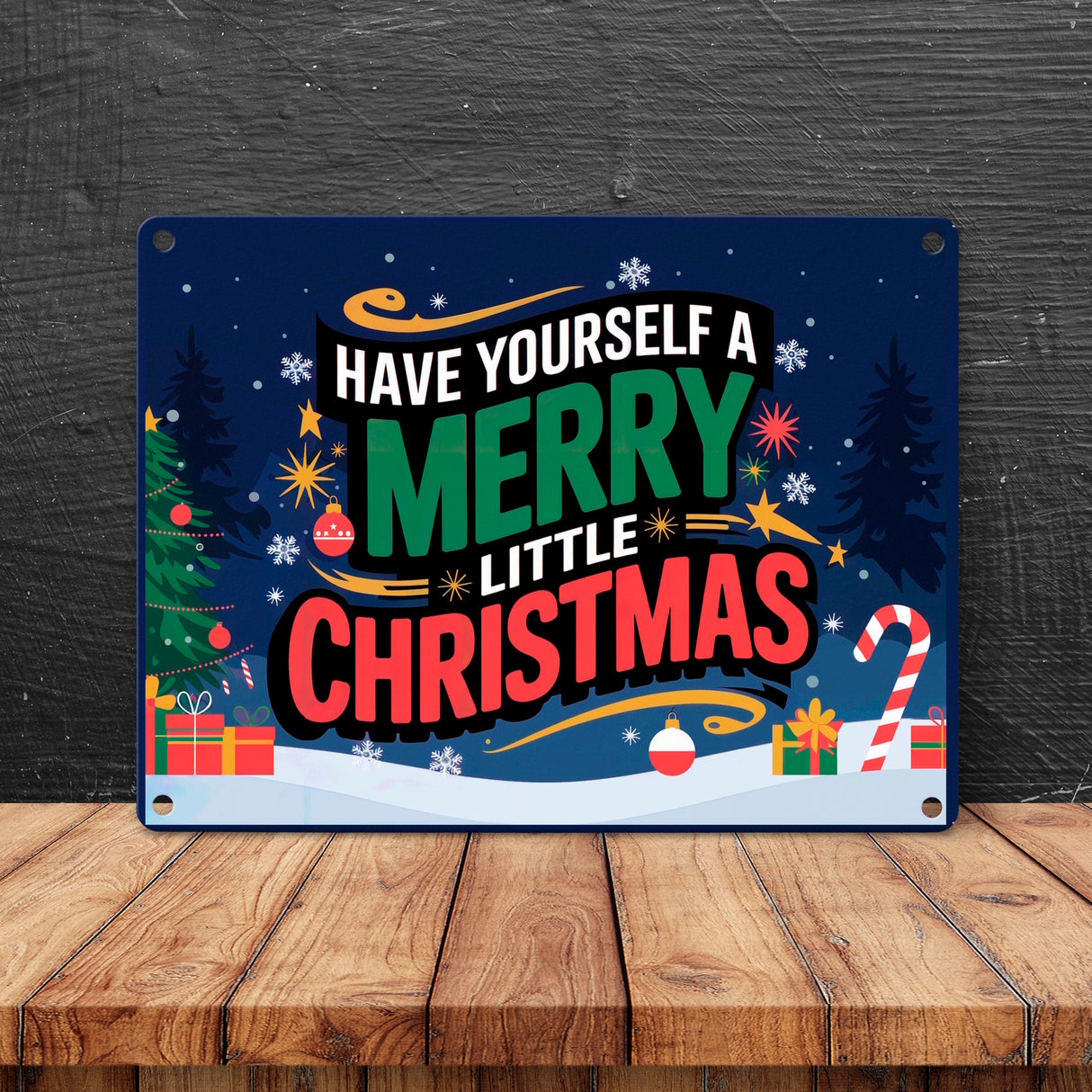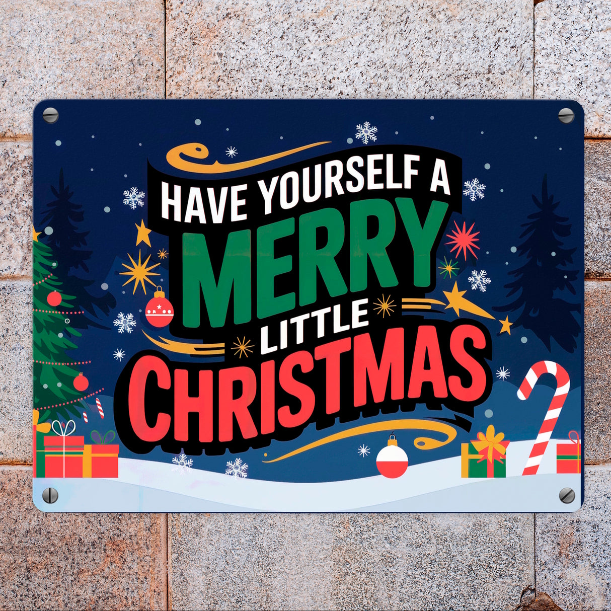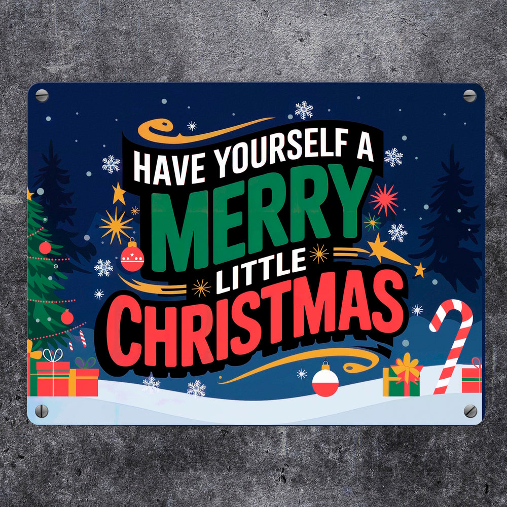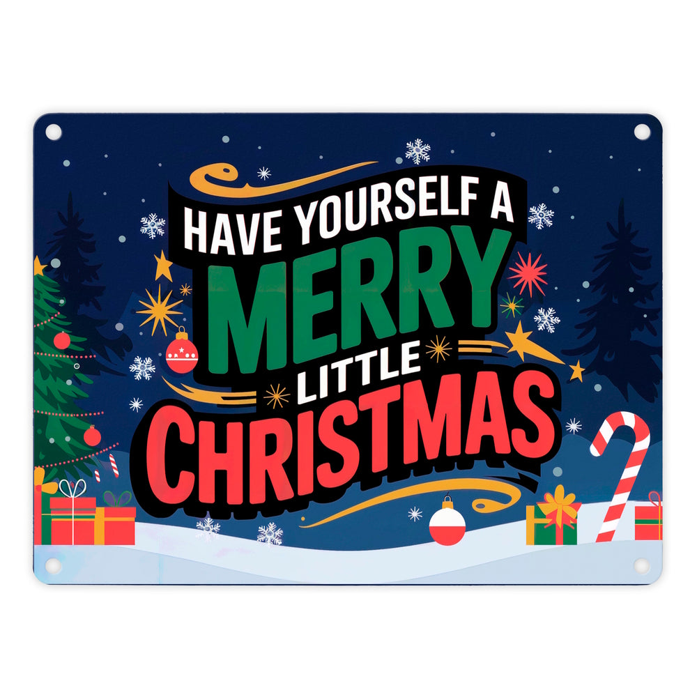 - Ho, ho, ho! Begrüßen Sie die Weihnachtszeit mit unserem festlichen Metallschild! Diese wunderbare Weihnachtsillustration versetzt Sie direkt in eine verschneite Traumlandschaft. Sehen Sie den glitzernden Weihnachtsbaum, versteckte Geschenke und die fröhliche Zuckerstange? Dazu strahlt die bunte Botschaft: "HAVE YOURSELF A MERRY LITTLE CHRISTMAS".