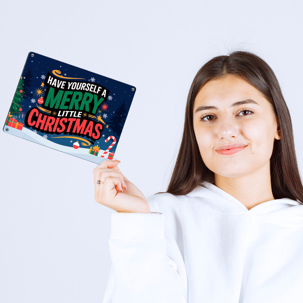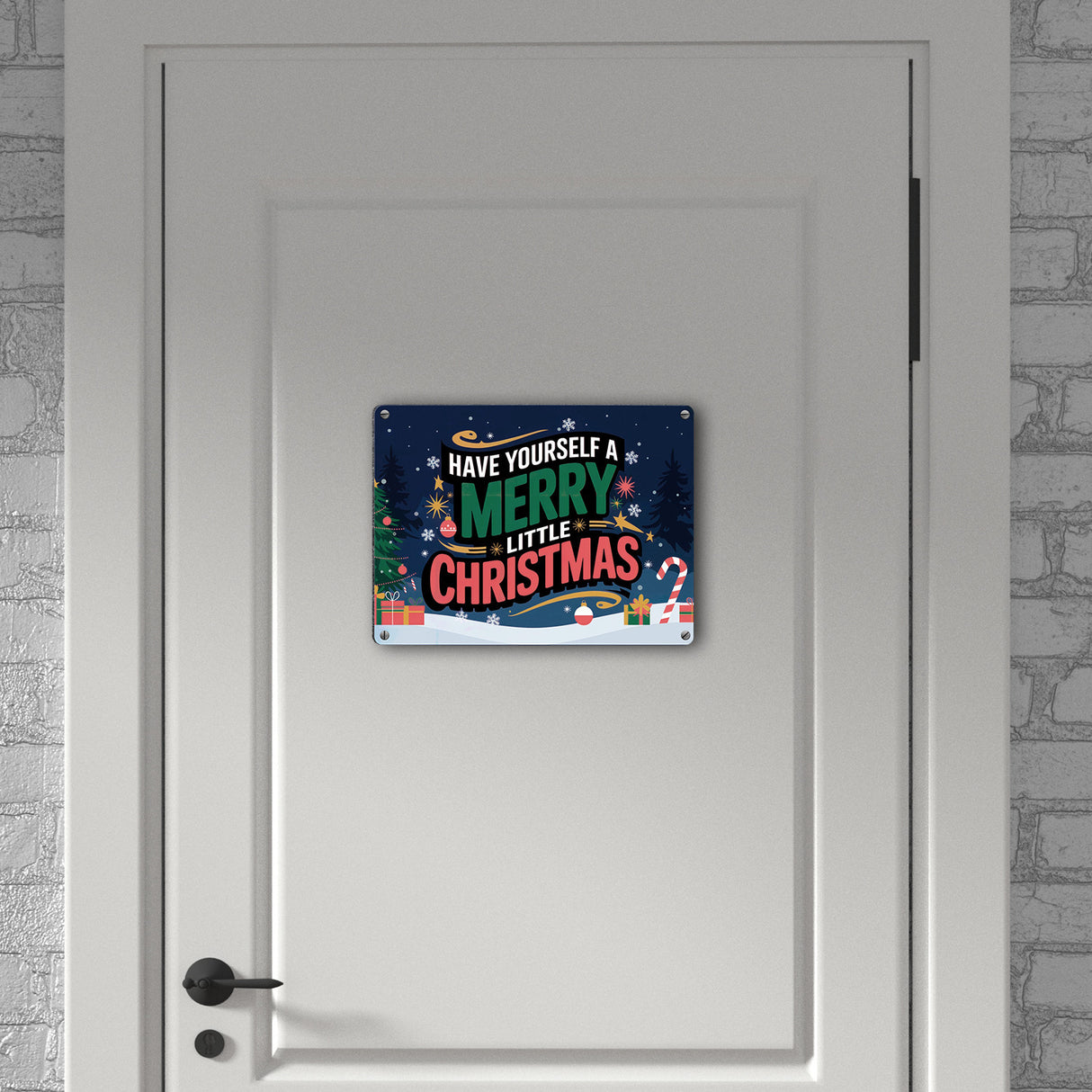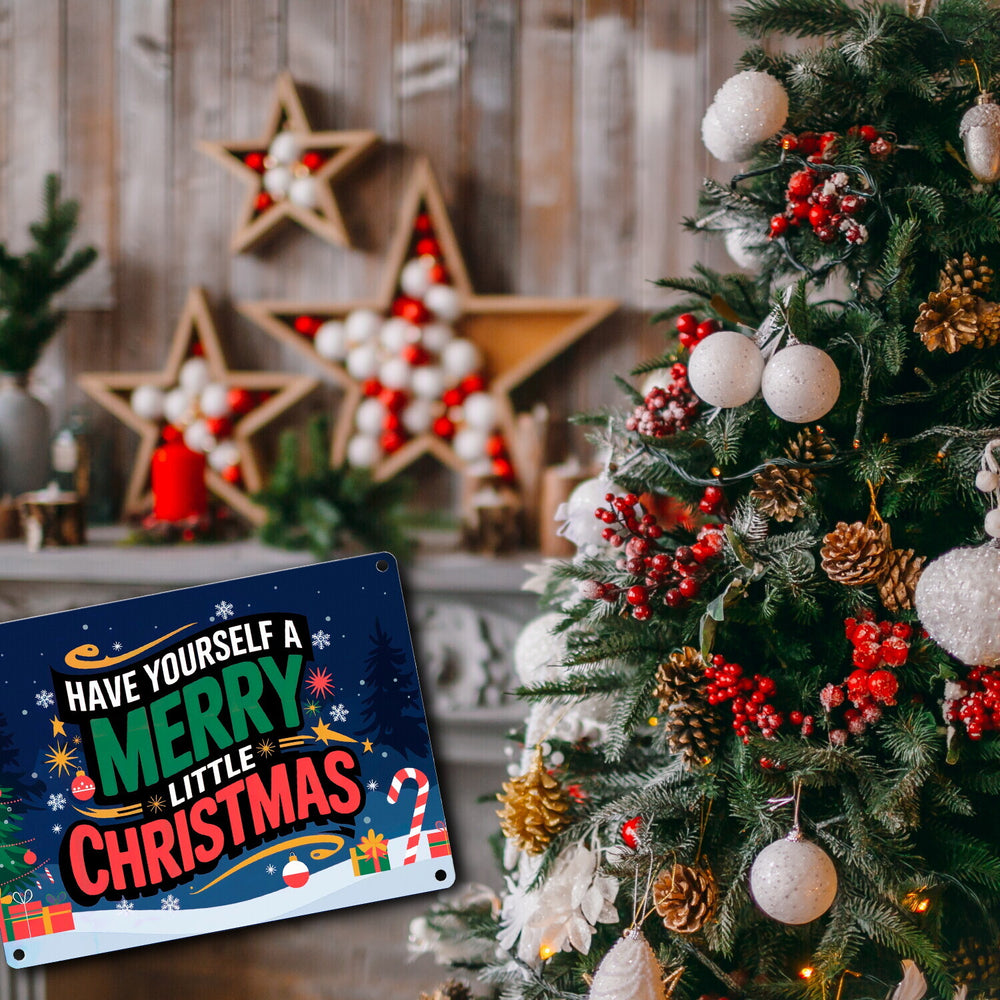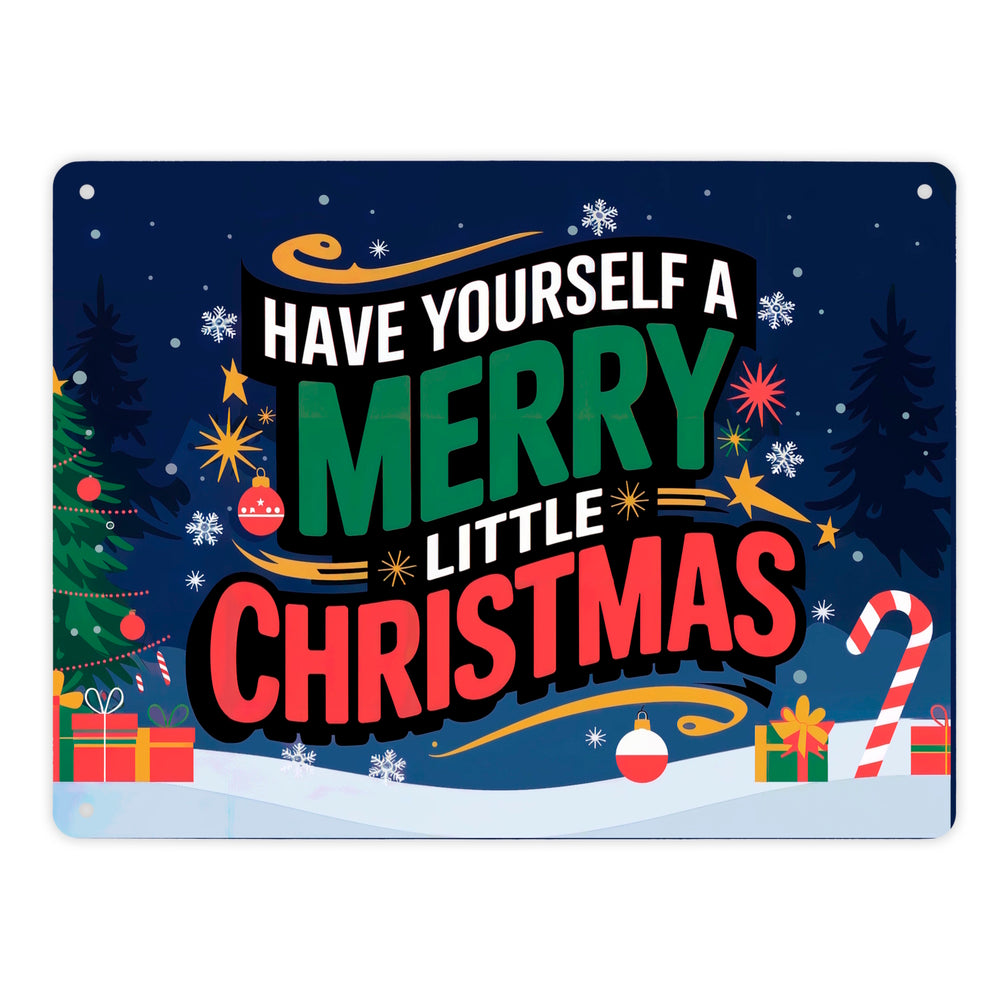 - Ho, ho, ho! Begrüßen Sie die Weihnachtszeit mit unserem festlichen Metallschild! Diese wunderbare Weihnachtsillustration versetzt Sie direkt in eine verschneite Traumlandschaft. Sehen Sie den glitzernden Weihnachtsbaum, versteckte Geschenke und die fröhliche Zuckerstange? Dazu strahlt die bunte Botschaft: "HAVE YOURSELF A MERRY LITTLE CHRISTMAS".