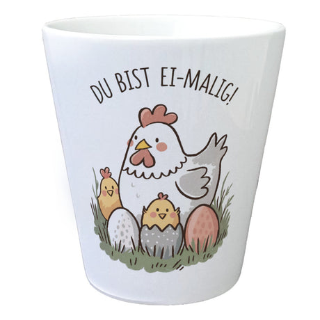 - Der Blumentopf "Henne mit Küken" ist eine charmante Kreation. Eine niedliche Henne sitzt auf ihren Eiern, begleitet von zwei neugierigen Küken. Mit dem Spruch "Du bist Ei-Malig!" wird es zur humorvollen Botschaft. Der weiße Hintergrund und sanfte Farben machen ihn zu einem liebenswerten Hingucker.
