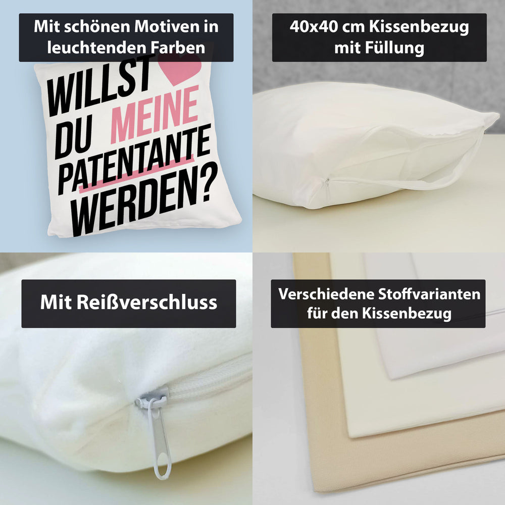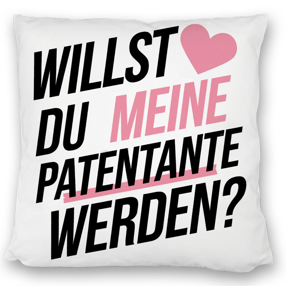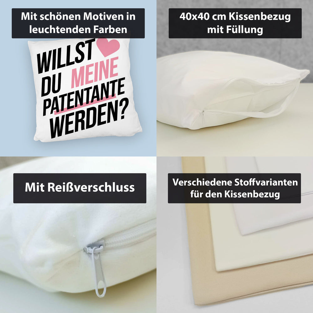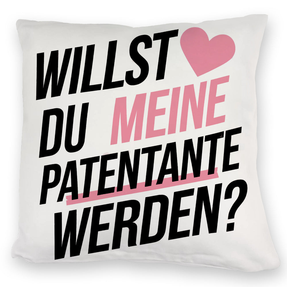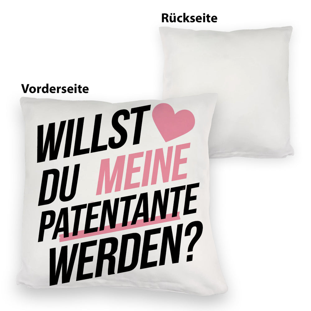 - Stell dir vor, ein Kissen, das nicht nur bequem ist, sondern auch eine große Frage stellt! Unser Patentante werden - Kissen ist mit einem stylischen Design in Schwarz, Weiß und Pink ein echter Hingucker. Dieses Kissen fragt mit Herzklopfen: "Willst du meine Patentante werden?". Ein Must-Have für zukünftige Lieblingspatentanten!
