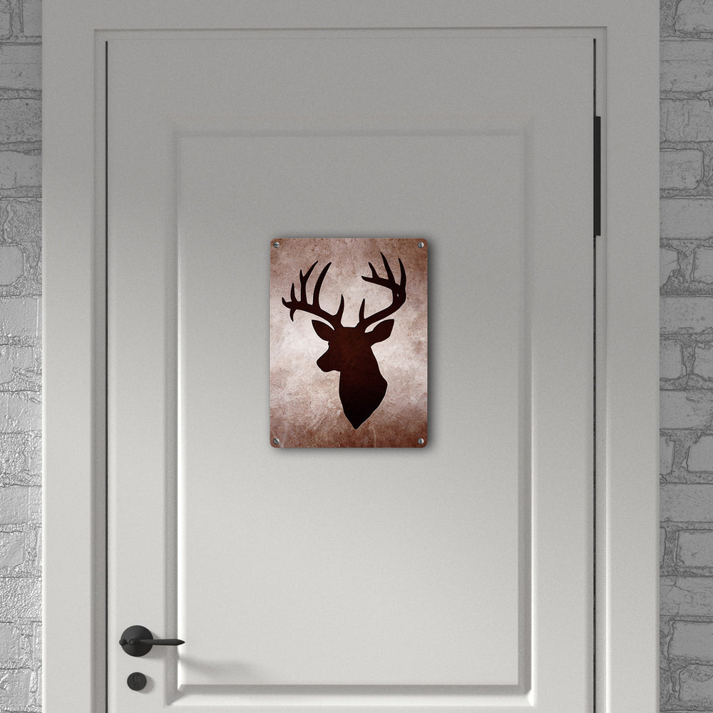 - Dieses Metallschild ist ein echter Hingucker! Es zeigt die Silhouette eines majestätischen Hirschkopfes mit beeindruckendem Geweih vor einem strukturierten, beigen Hintergrund. Der sanfte Kontrast zwischen dem starken Motiv und dem weichen Hintergrund verleiht dem Design eine faszinierende Tiefe und Fokussierung.