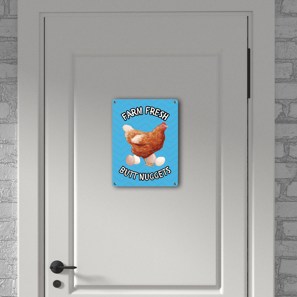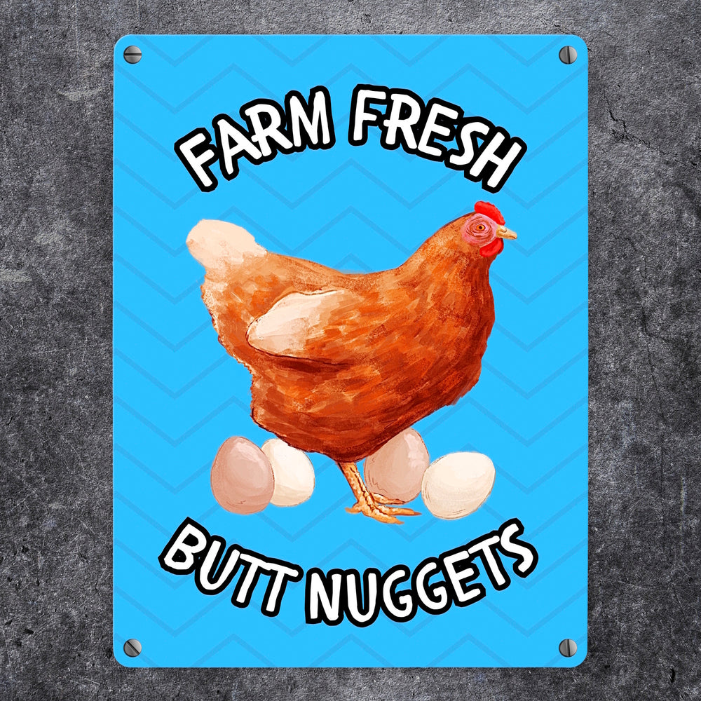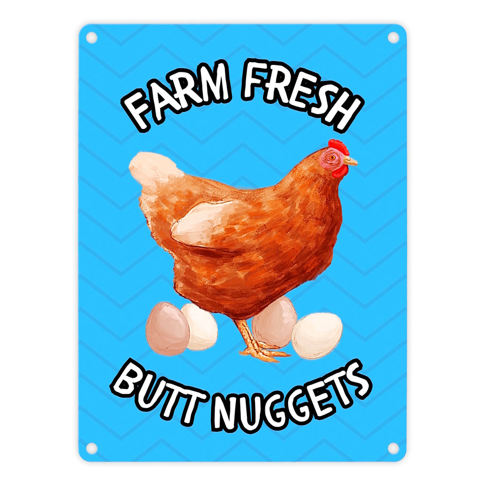 • 1x Huhn Metallschild in 15x20 cm mit Spruch Farm fresh Butt Nuggets in der gewählten Größe