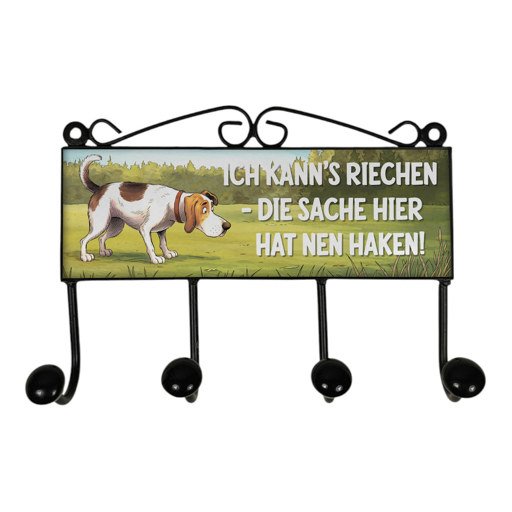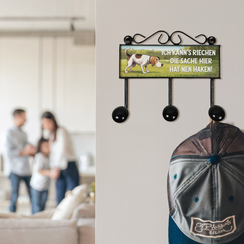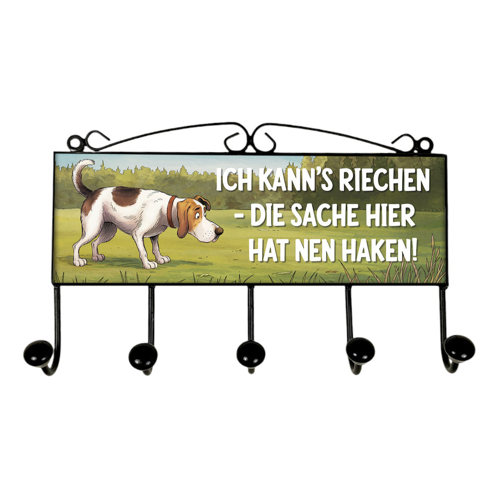 - Die Hund Kleiderhaken Leiste zeigt eine humorvolle Illustration: Ein Hund schnüffelt gespannt in Richtung des Betrachters. Im Hintergrund ist eine grüne Wiese und ein Wald zu sehen. Der witzige Spruch "Ich kann's riechen - die Sache hier hat nen Haken!" verleiht der Leiste einen besonderen Charme und macht sie zu einem echten Hingucker.