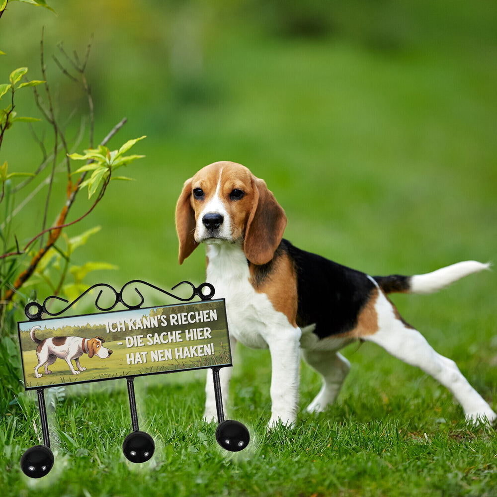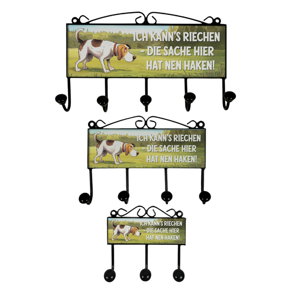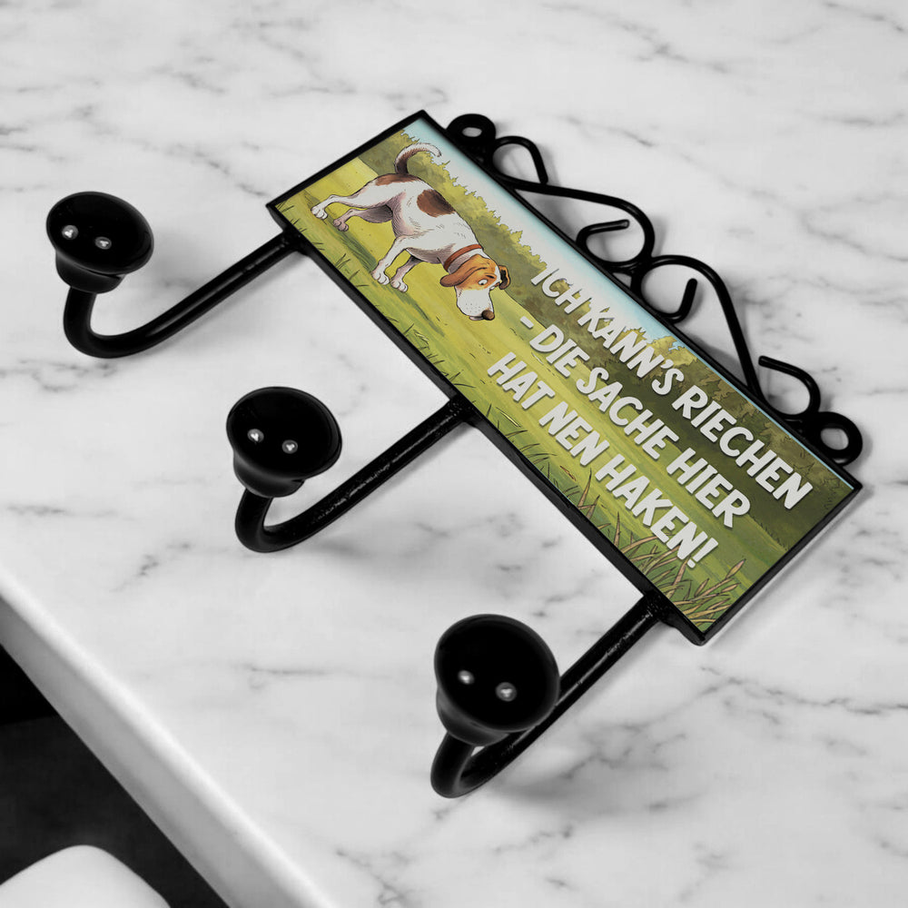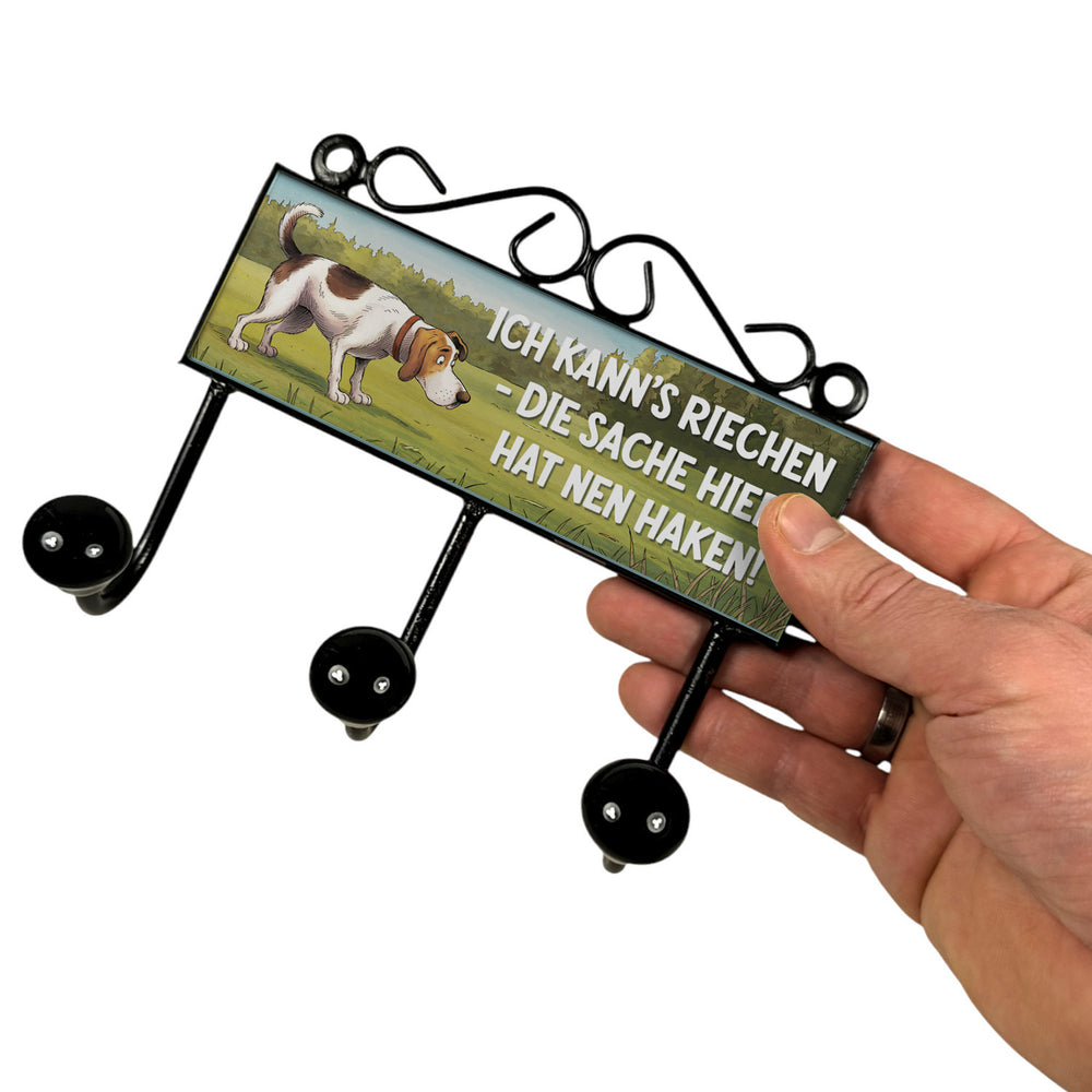 - Die Hund Kleiderhaken Leiste zeigt eine humorvolle Illustration: Ein Hund schnüffelt gespannt in Richtung des Betrachters. Im Hintergrund ist eine grüne Wiese und ein Wald zu sehen. Der witzige Spruch "Ich kann's riechen - die Sache hier hat nen Haken!" verleiht der Leiste einen besonderen Charme und macht sie zu einem echten Hingucker.