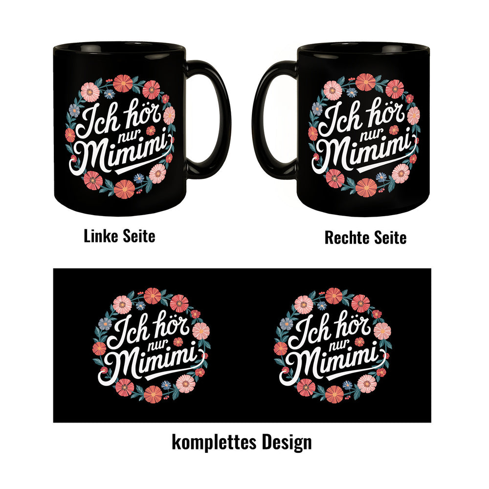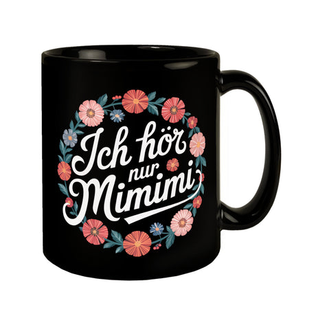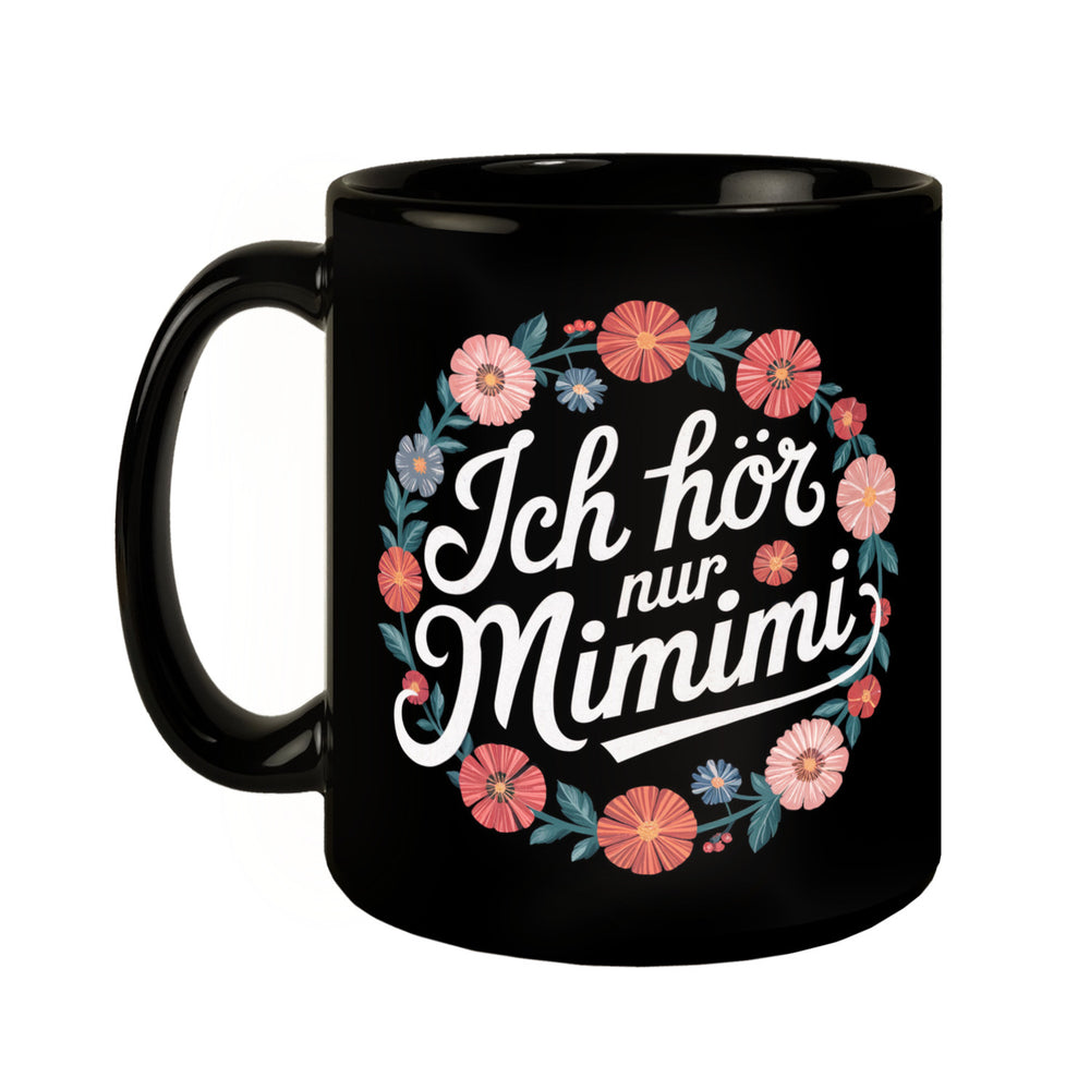 Stopp mimimi, bitte! Entdecke die brillante "Ich hör nur mimimi" Tasse in tiefem Schwarz. Diese Kaffetasse kombiniert Vintage-Illustration mit einer verspielten, geschwungenen Schriftart. Der florale Blumenkranz setzt dem Ganzen die Krone auf und Hinweise: Fassungsvermögen: ca. 300ml