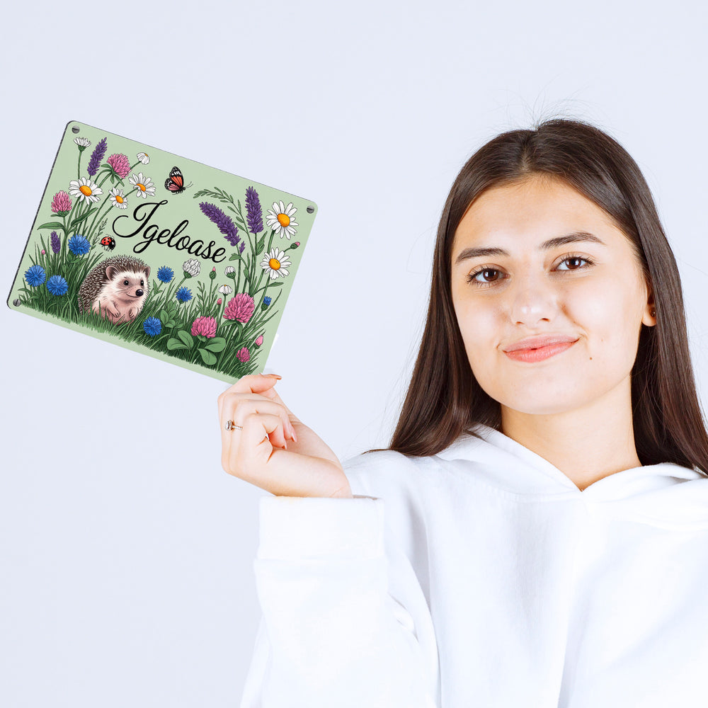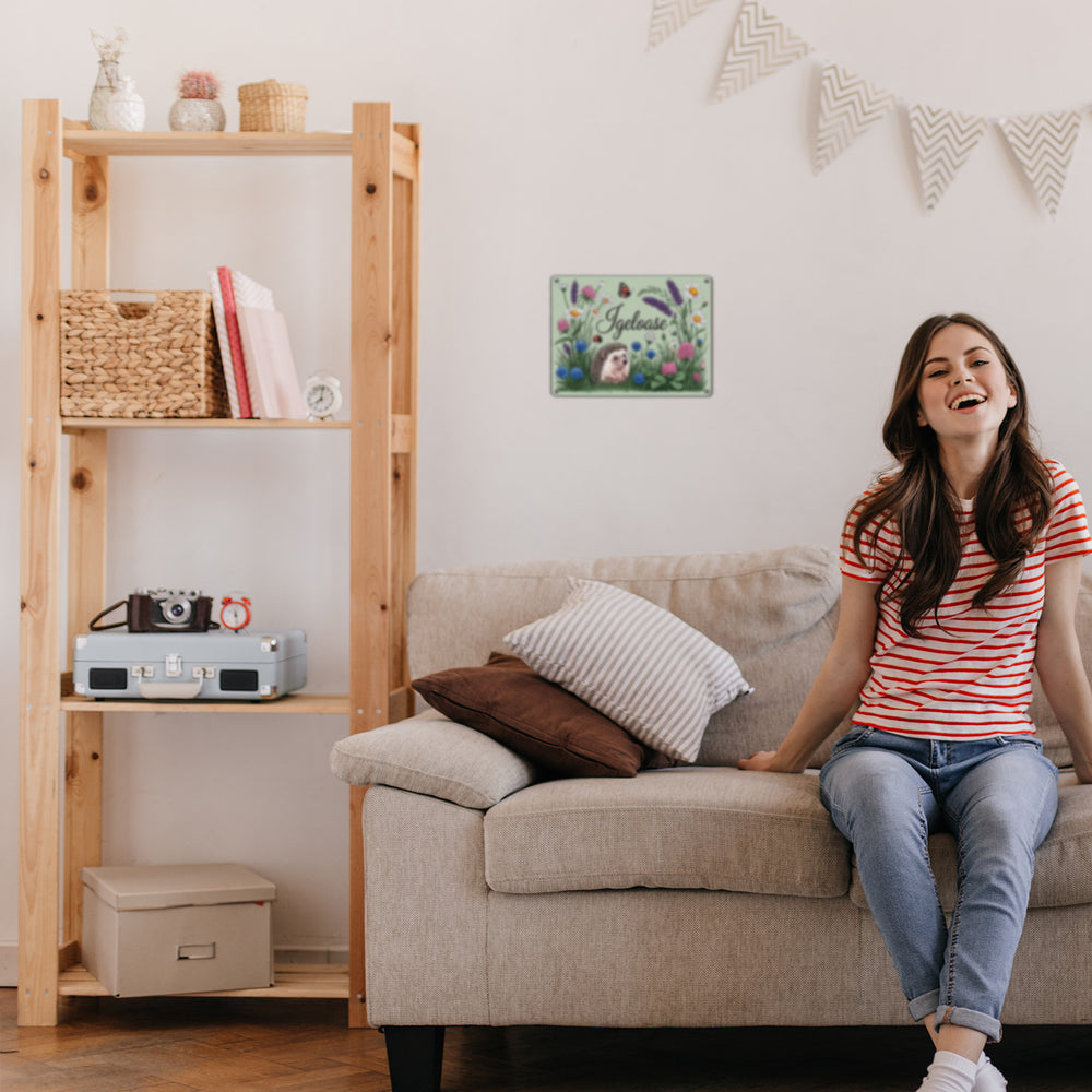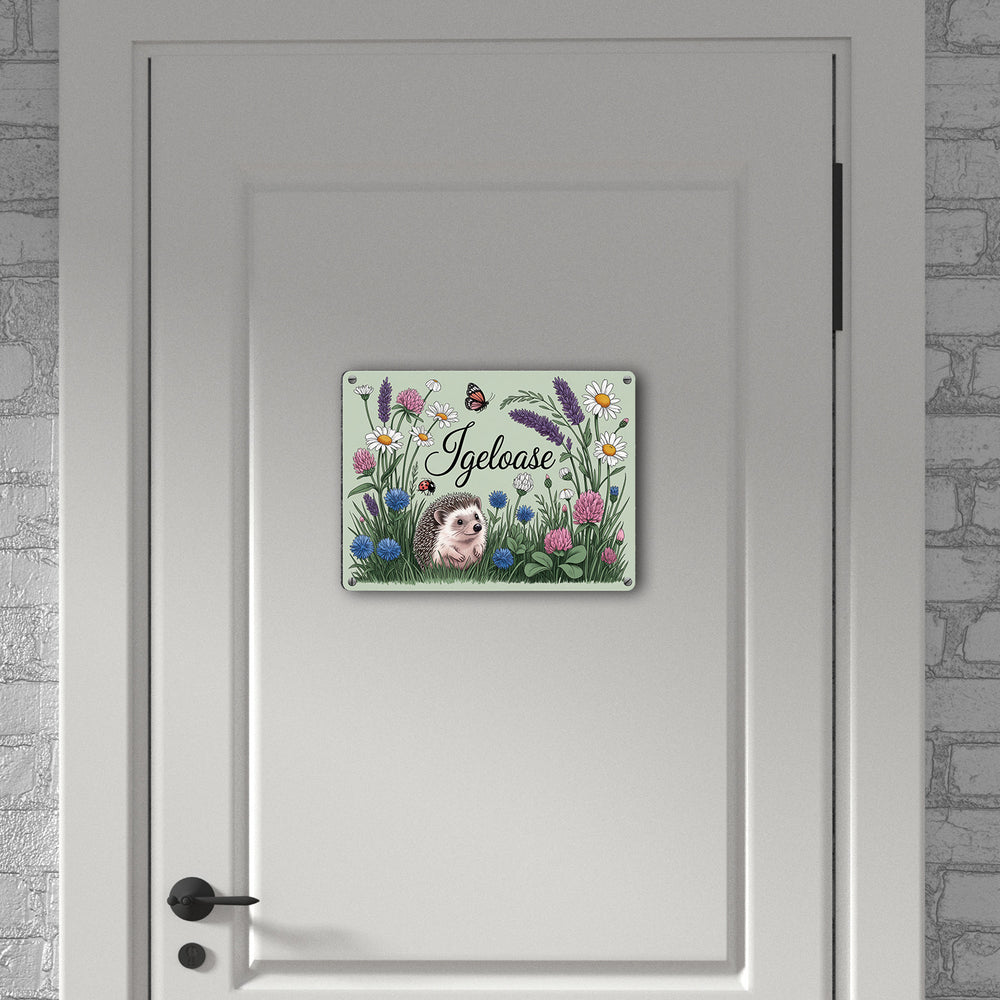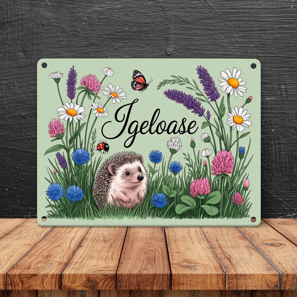 - Das Metallschild "Igel auf Wildblumen" zeigt eine bezaubernde Szene mit einem niedlichen Igel, der in einer üppig blühenden Wiese sitzt. Umgeben von Gänseblümchen, Lavendel und Schmetterlingen, ist die Illustration ein Highlight in feiner Linienkunst mit sanfter Aquarellfarbe. Ein weicher, salbeigrüner Hintergrund rundet das Bild ab.