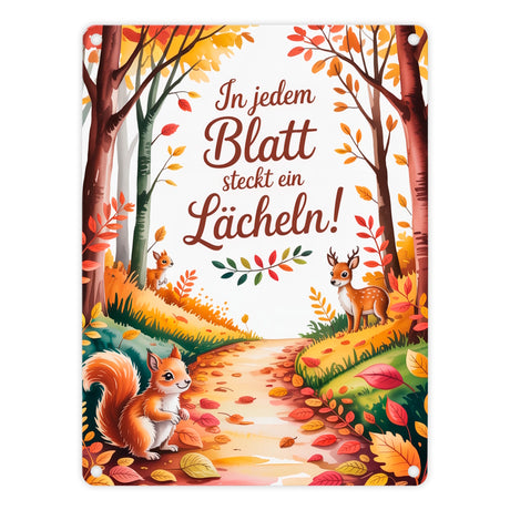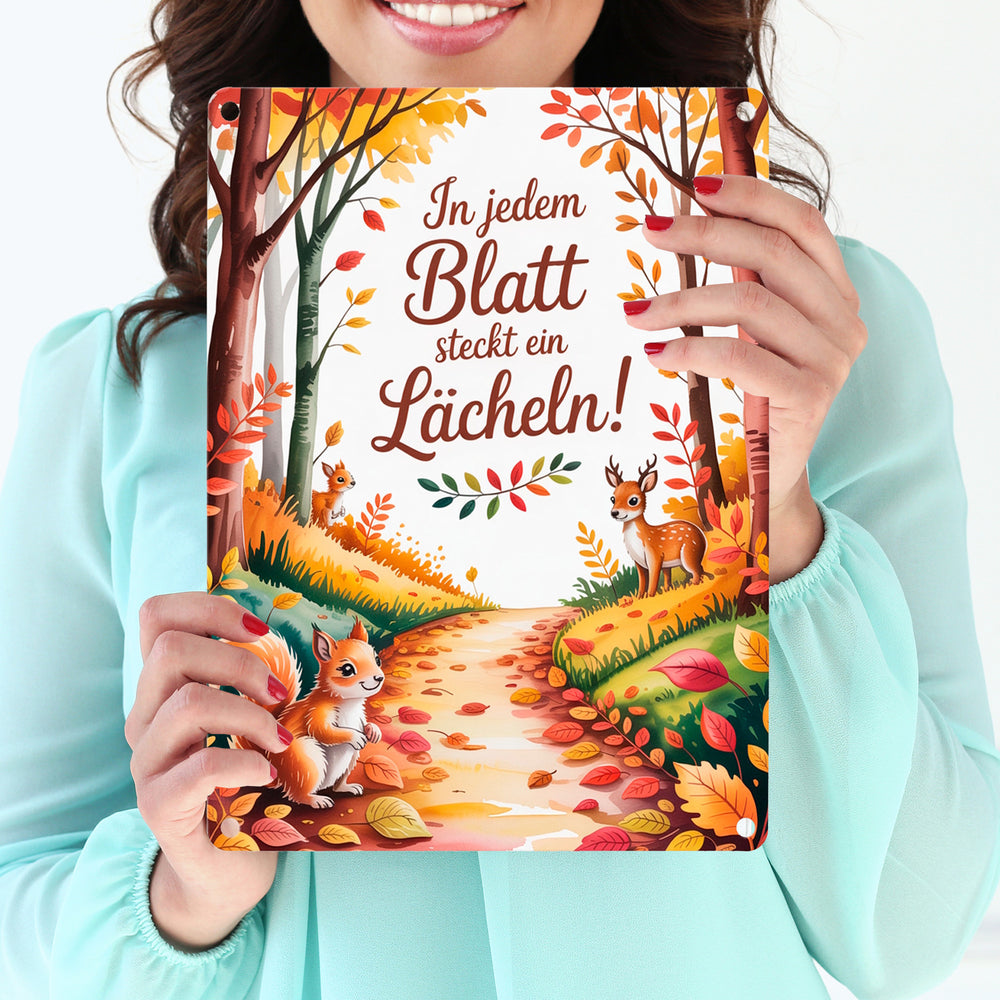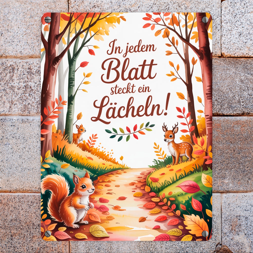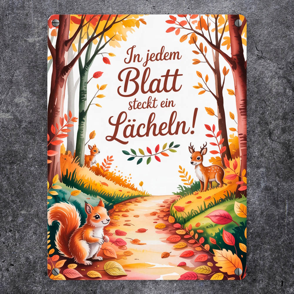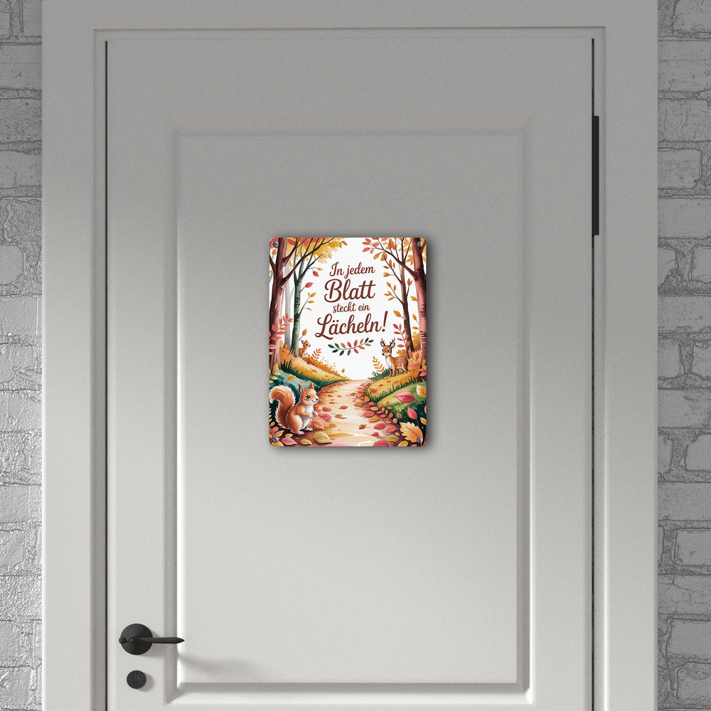 In jedem Blatt steckt ein Lächeln Herbstlicher Waldweg Metallschild in 15x20 cm