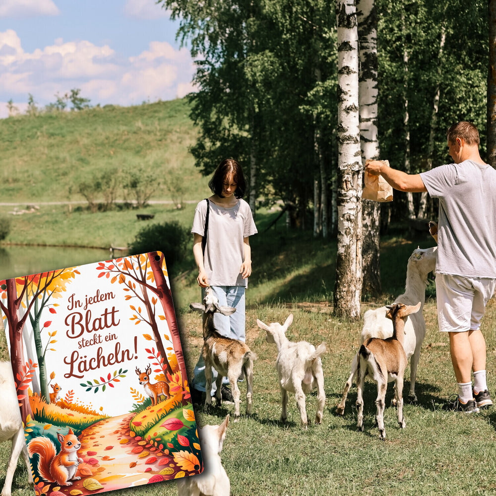 • Dieses goldige Metallschild zeigt einen verwunschenen Waldweg voller schillernder Herbstblätter in scharlachrot, gold und rostbraun. Ein kleines Eichhörnchen und ein neugieriges Reh lugen charmant hervor, während der Spruch "In jedem Blatt steckt ein Lächeln!" sich in warmem Braun darüber erstreckt. Perfekte Kombination aus Aquarellkunst und Naturidylle.