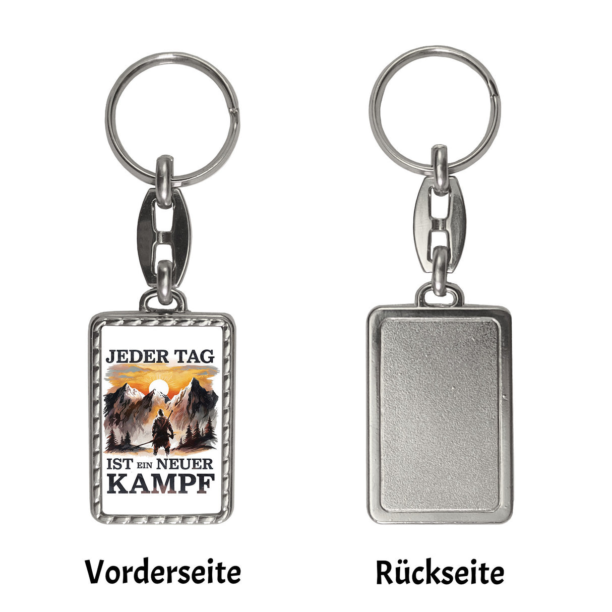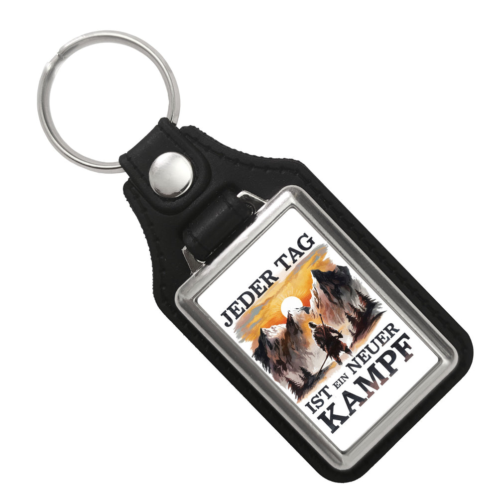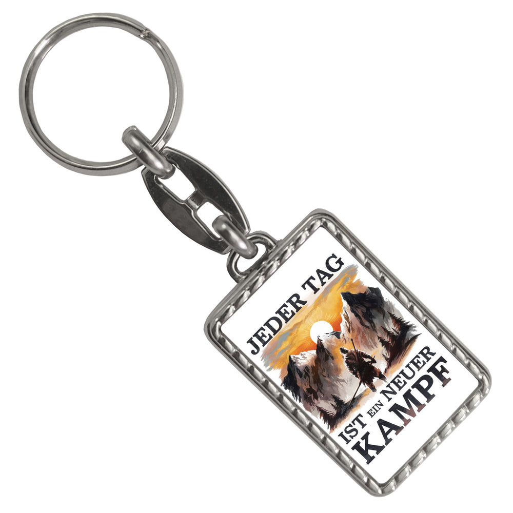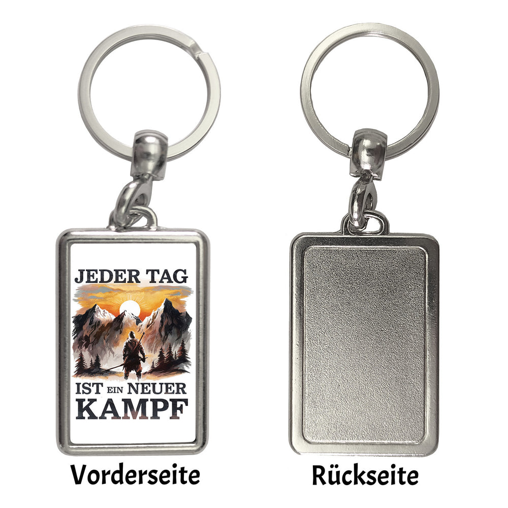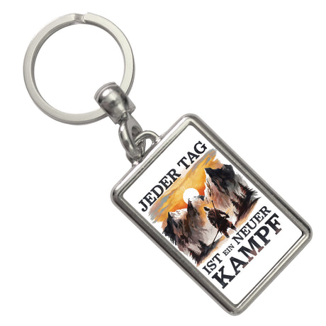 - Der Schlüsselanhänger zeigt eine atemberaubende Berglandschaft bei Sonnenaufgang oder -untergang in Pastellfarben. Auf weißem Hintergrund steht in großem Buchstaben „Jeder Tag ist ein neuer Kampf“. Eine Silhouette eines mutigen Entdeckers mit Speer blickt auf die schneebedeckten Gipfel und dichten Wälder. Ein Hauch von Abenteuer in der Hosentasche!