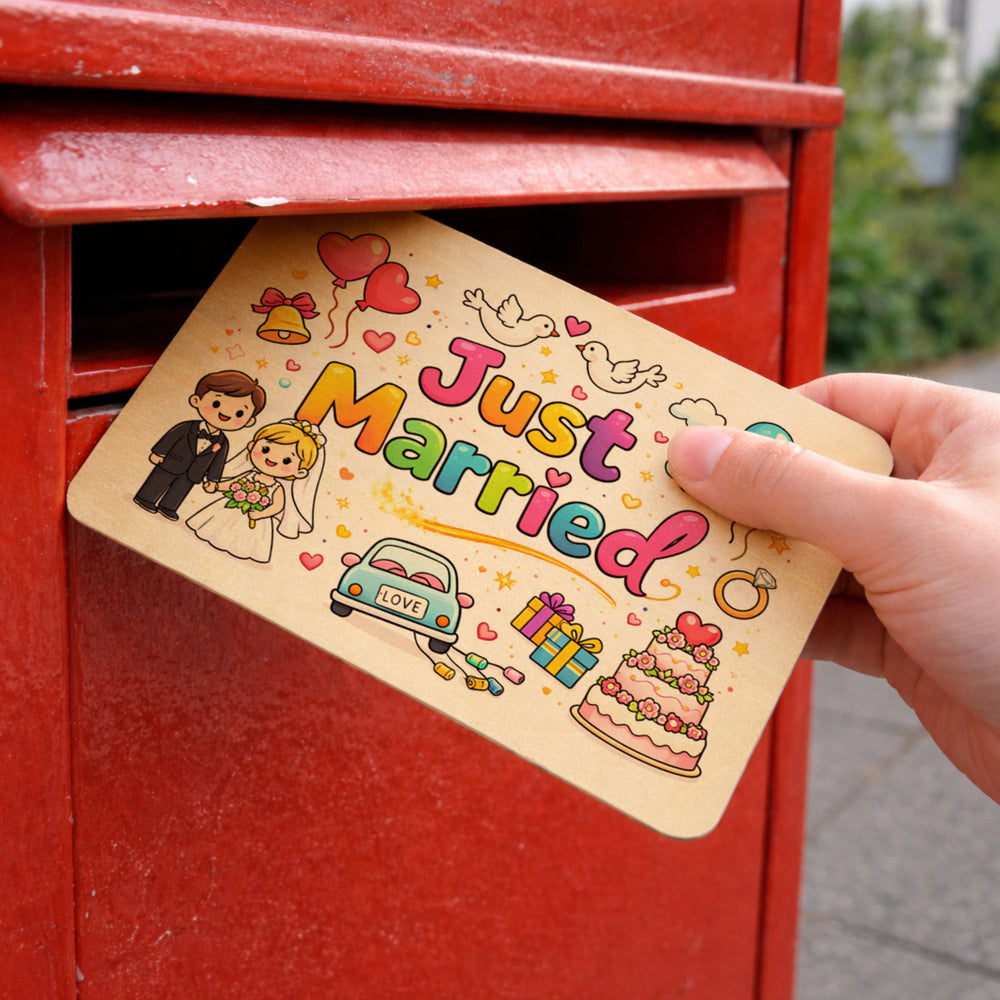 • Diese bezaubernde Holzpostkarte strahlt mit einer regenbogenfarbenen "Just Married"-Botschaft. Umgeben von weißen Tauben, herzigen Ballons und einem fröhlichen Hochzeitsauto, vereint sie alles, was eine fröhliche Hochzeitsszene benötigt. Der niedliche Cartoon-Stil mit leuchtenden Farben zaubert jedem ein Lächeln ins Gesicht.
