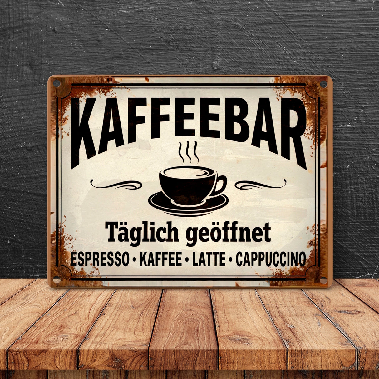 - Ein Touch von Nostalgie und rustikalem Charme dank der bräunlich-roten Spritzer. Perfekt für jede Wand! Hol dir dein Metallschild im Vintage-Stil und zeig, wo der Kaffee dampft!