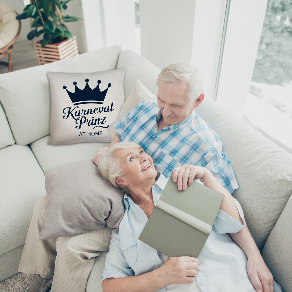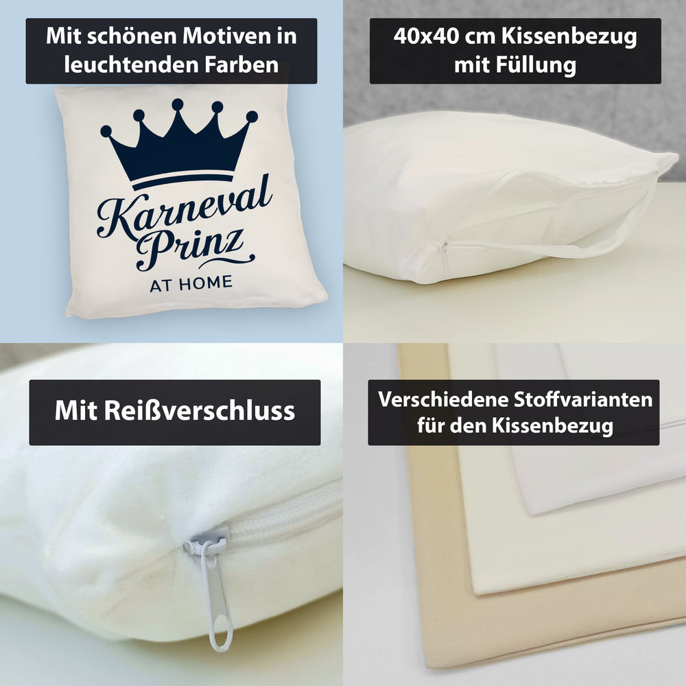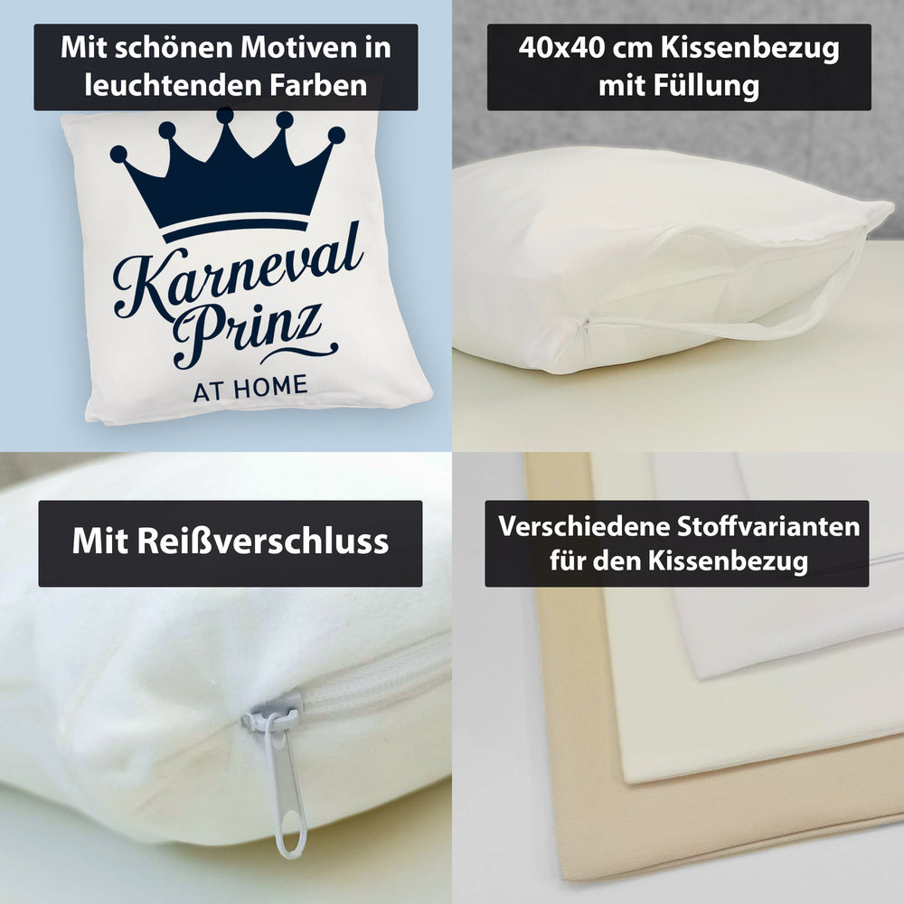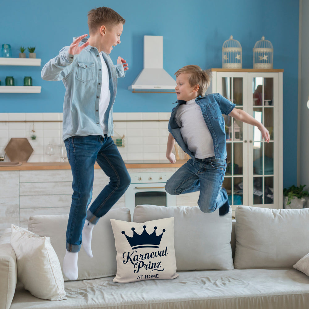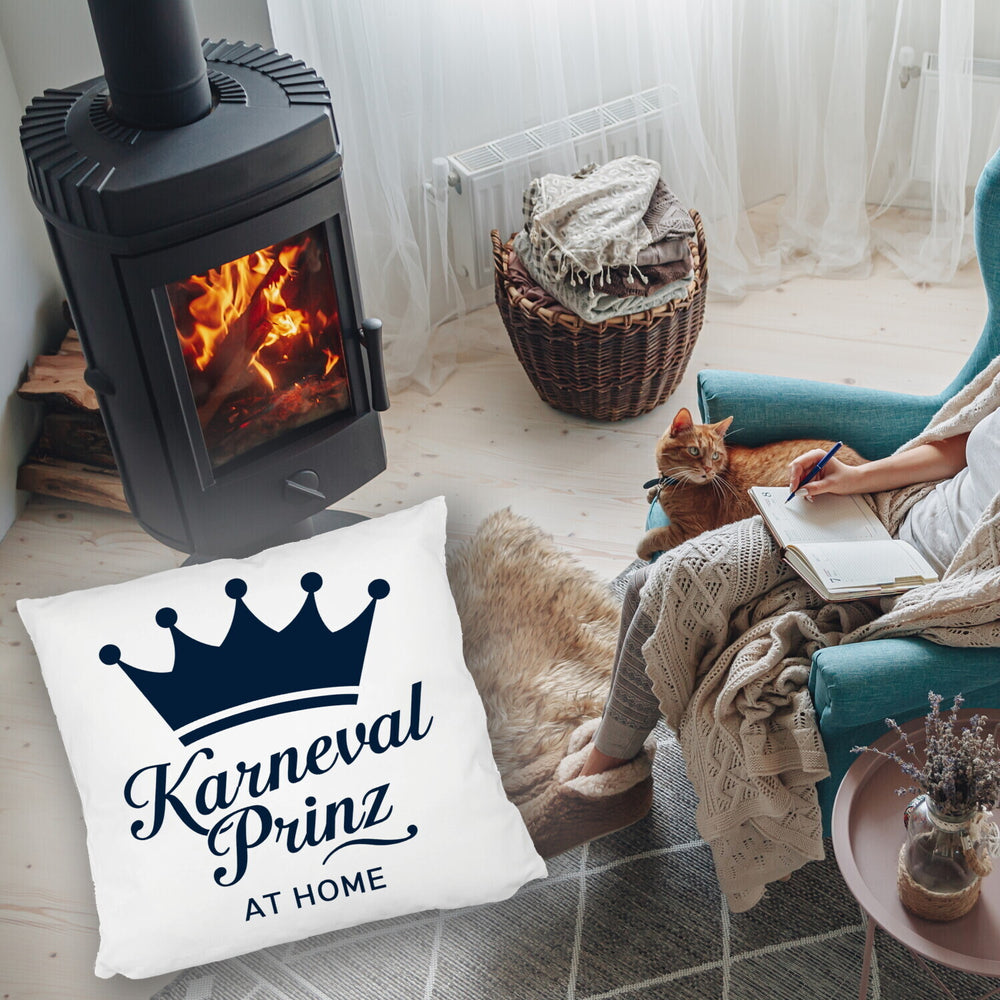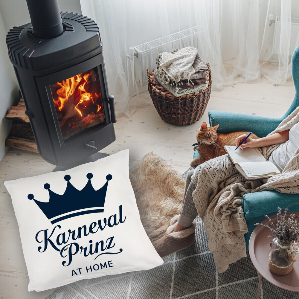 - Das Königliche Krone Kissen ist ein wahrer Hingucker! Mit einer stilisierten Krone in edlem Marineblau auf weißem Hintergrund zieht es alle Blicke auf sich. Der elegante Schriftzug "KARNEVAL PRINZ" in Kursivschrift und das kräftige "AT HOME" runden das Design ab. Ein Muss für alle Karnevals- und Deko-Liebhaber!