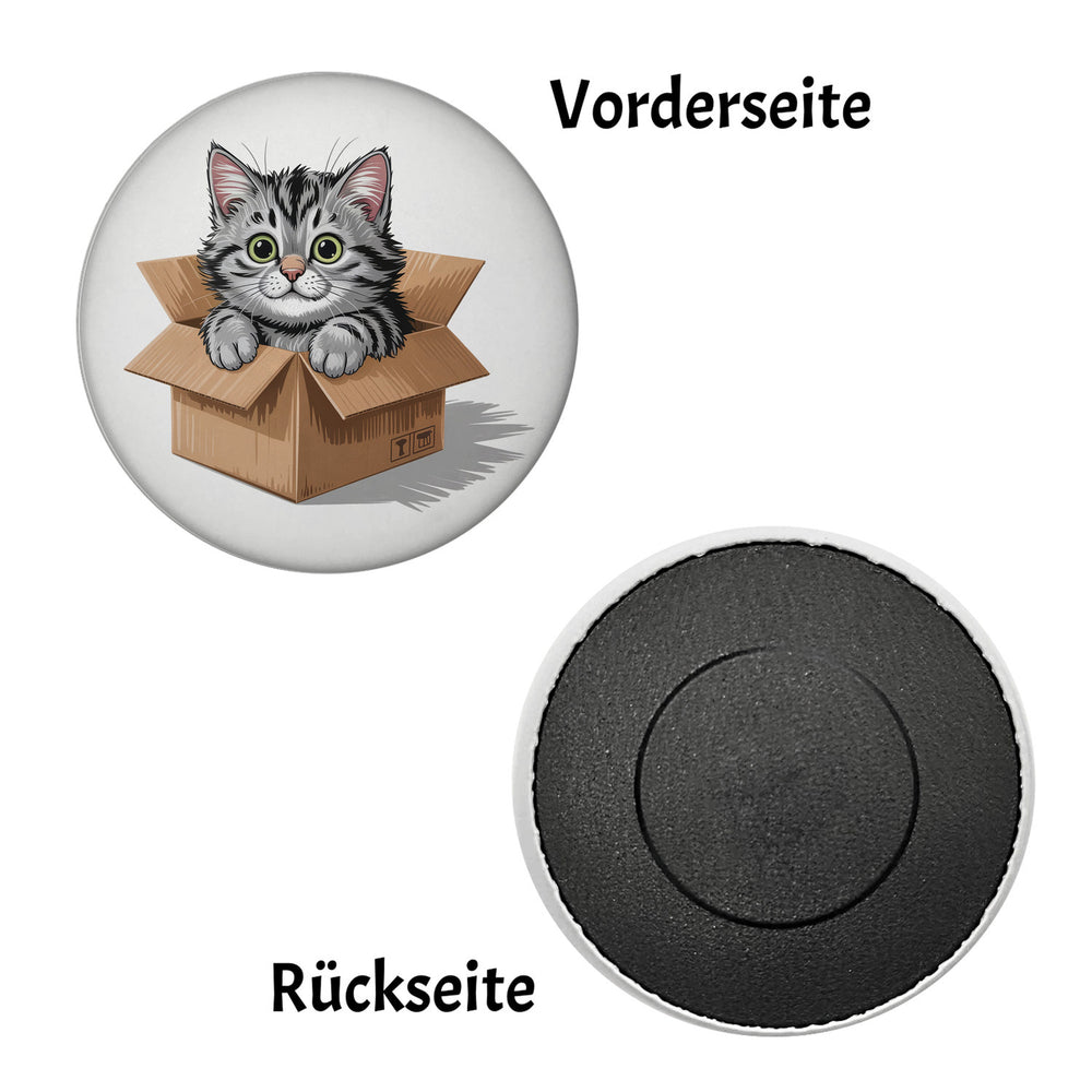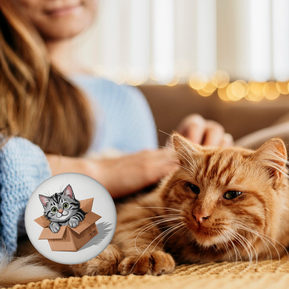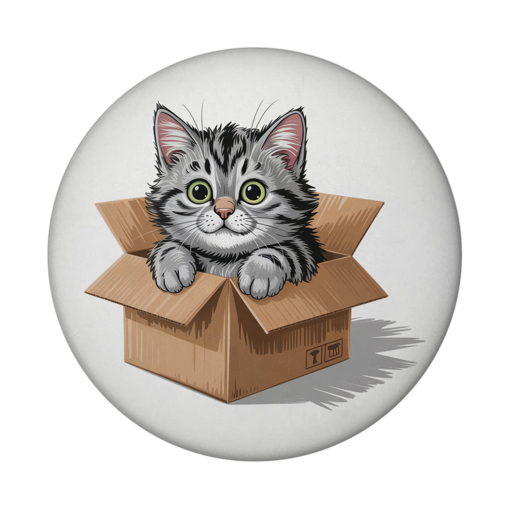 - Dieser runde Magnet zeigt eine süße graue Tabby-Katze, die versucht, sich in einen winzigen Pappkarton zu quetschen. Mit unschuldigen grünen Augen und besorgtem Ausdruck baumeln ihre Pfoten über den Rand des schlichten braunen Kartons. Der weiße Hintergrund und die weichen Schatten machen dieses Design zum Hingucker.