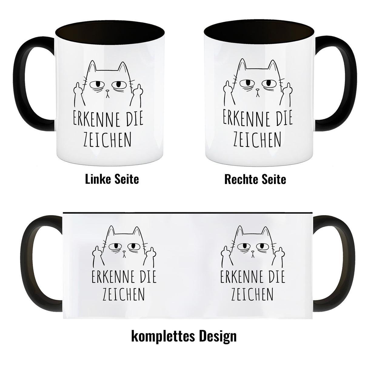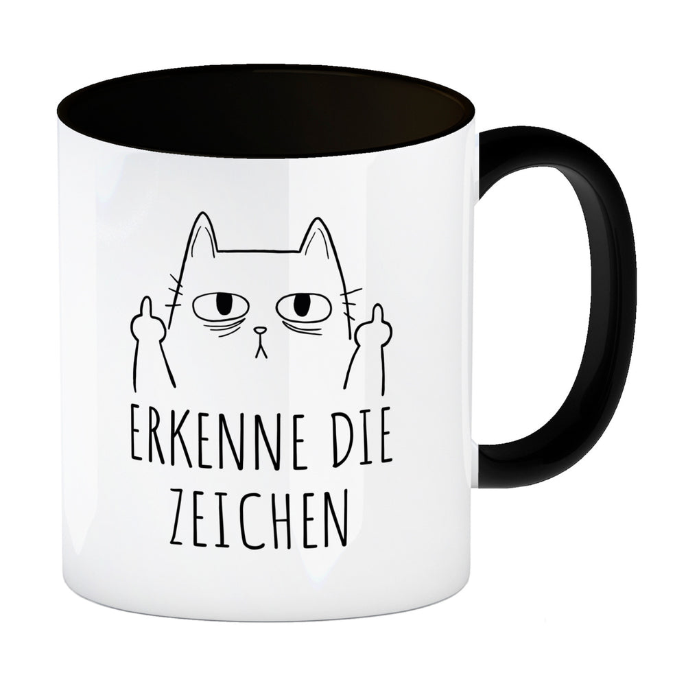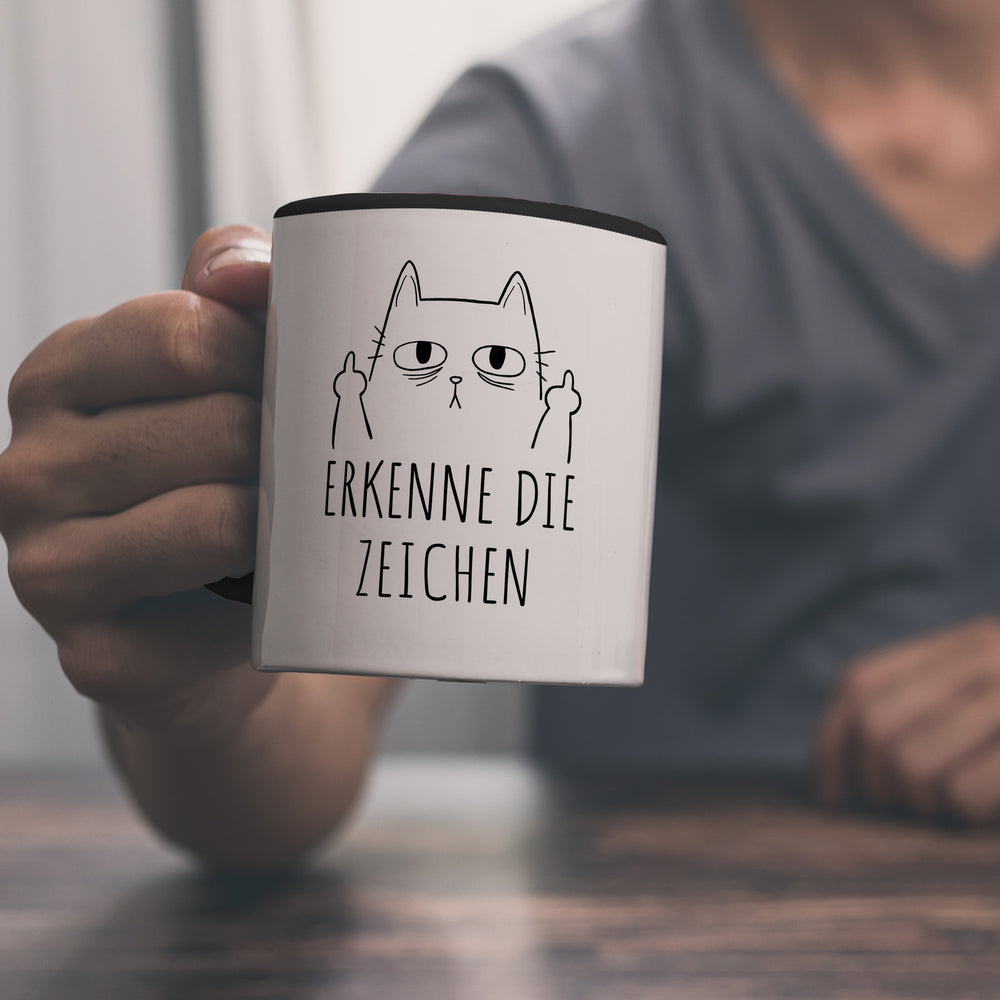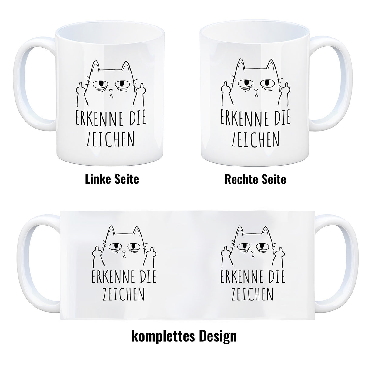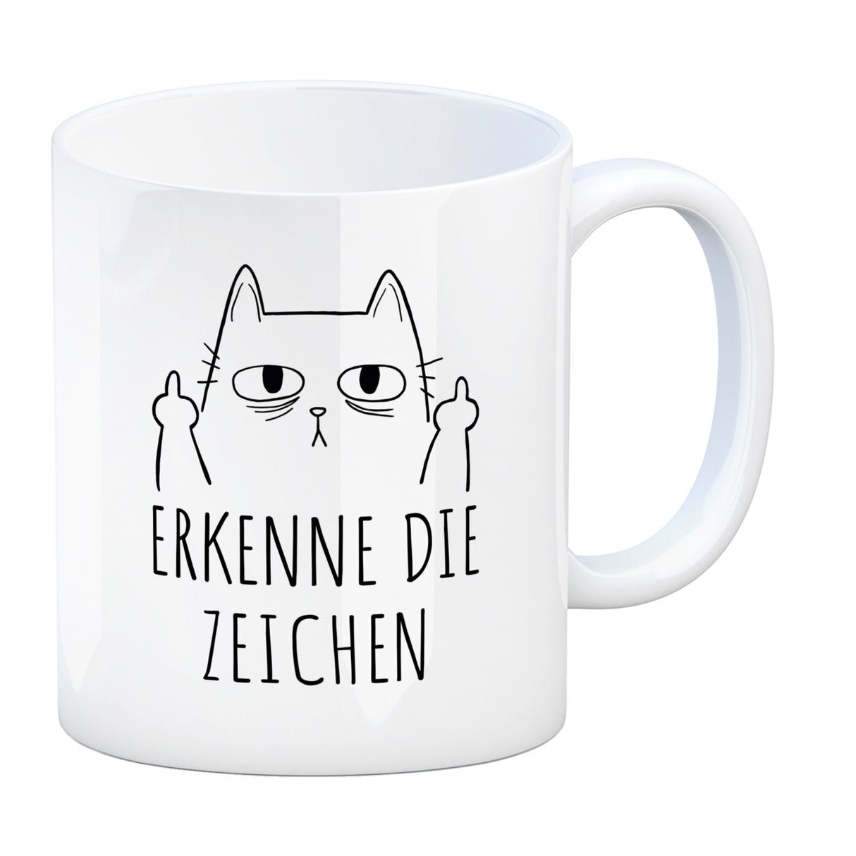- 1x Katze mit Mittelfinger Kaffeebecher mit Spruch Erkenne die Zeichen in der gewählten Ausführung