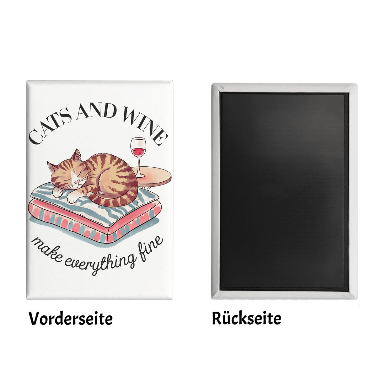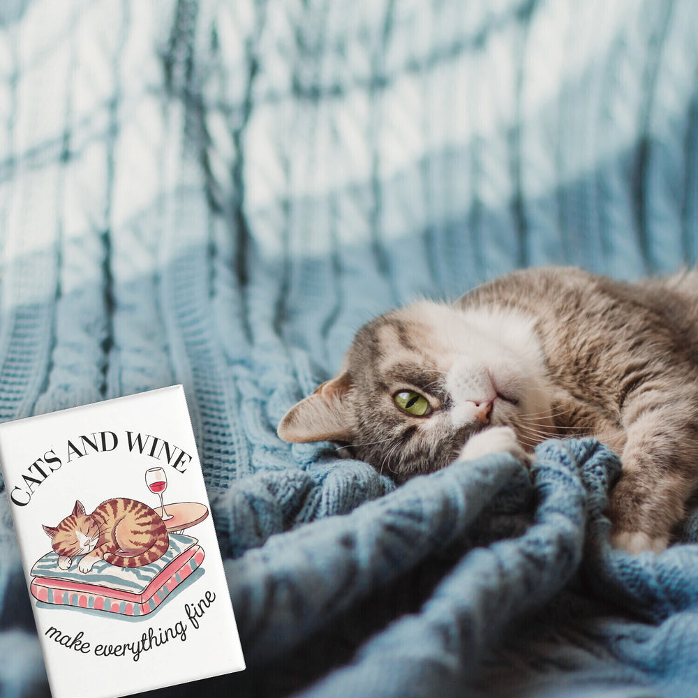 - Dieser humorvolle Kühlschrankmagnet zeigt eine schlafende Katze auf einem Kissen neben einem Rotweinglas. Der feminine Look und der Spruch "Cats and Wine make everything fine" machen den Magneten zu einem witzigen Hingucker. Der weiße Hintergrund sorgt für ein elegantes und gemütliches Flair in jeder Umgebung.