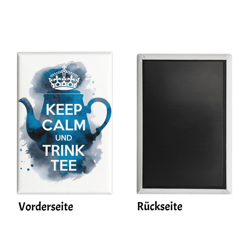 Der eckige Magnet zeigt eine farbenfrohe Teekanne mit einer Krone auf einem lebhaften blauen Aquarellhintergrund. Der Spruch "Keep calm und trink Tee" ist in großen Buchstaben auf der Silhouette der Teekanne zu lesen. Der Hintergrund aus Blau und Hinweise: Größe: ca. 8x5,5 cm