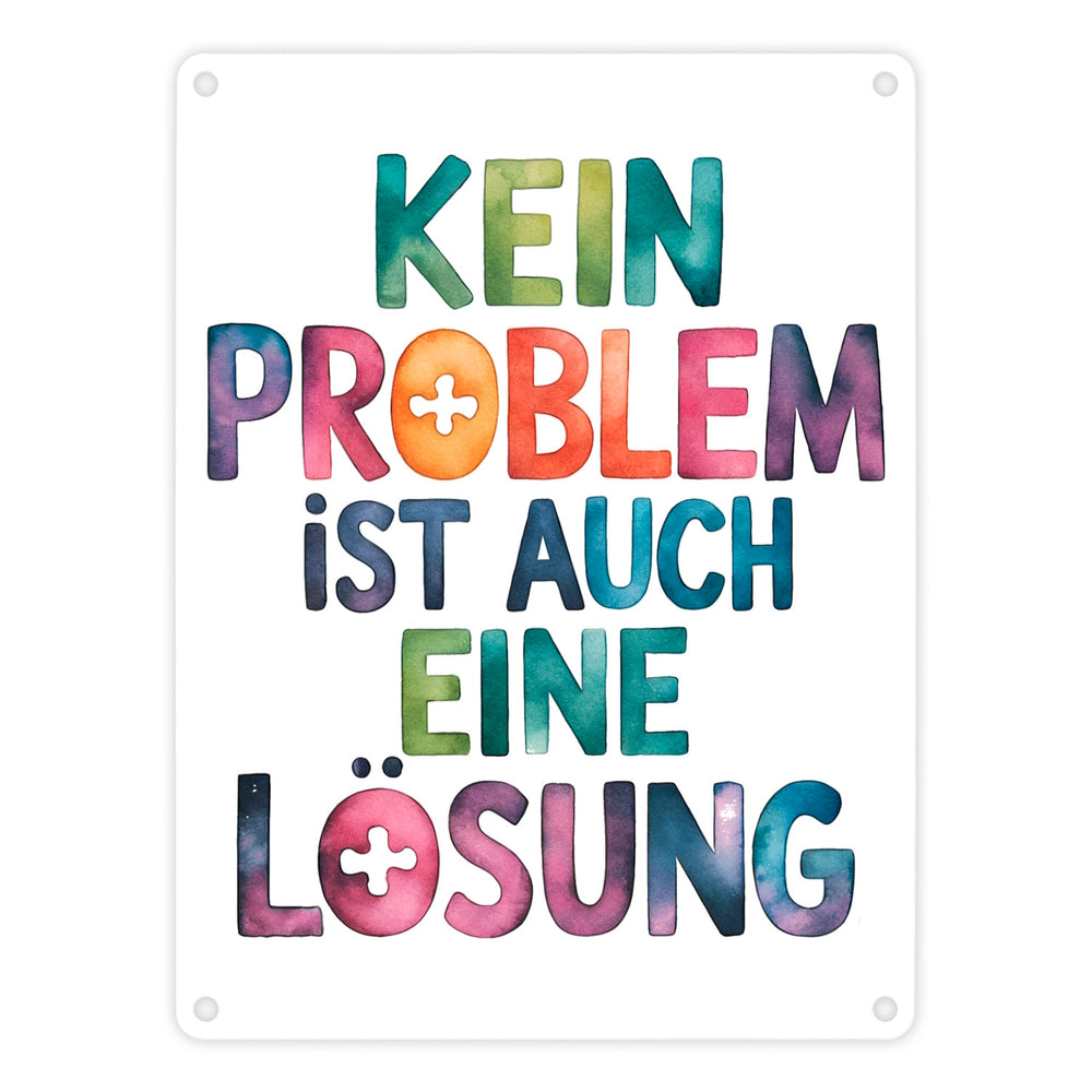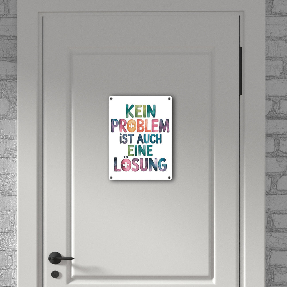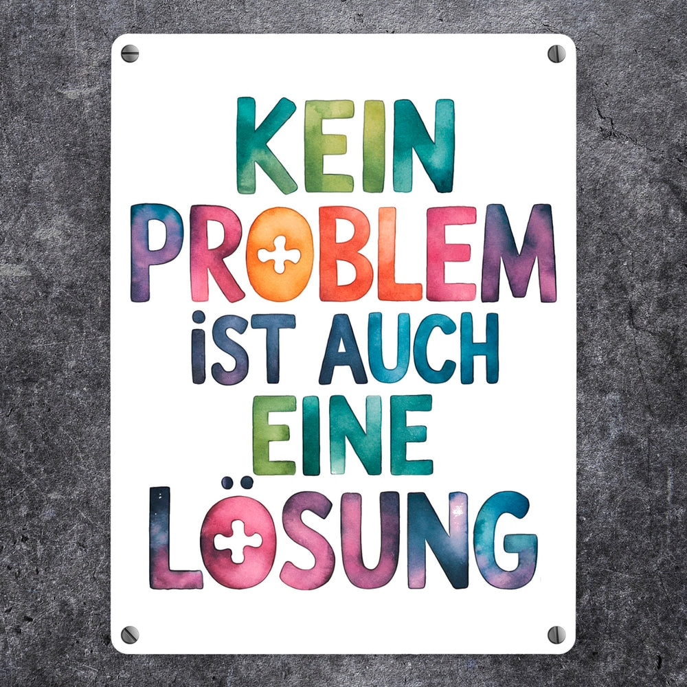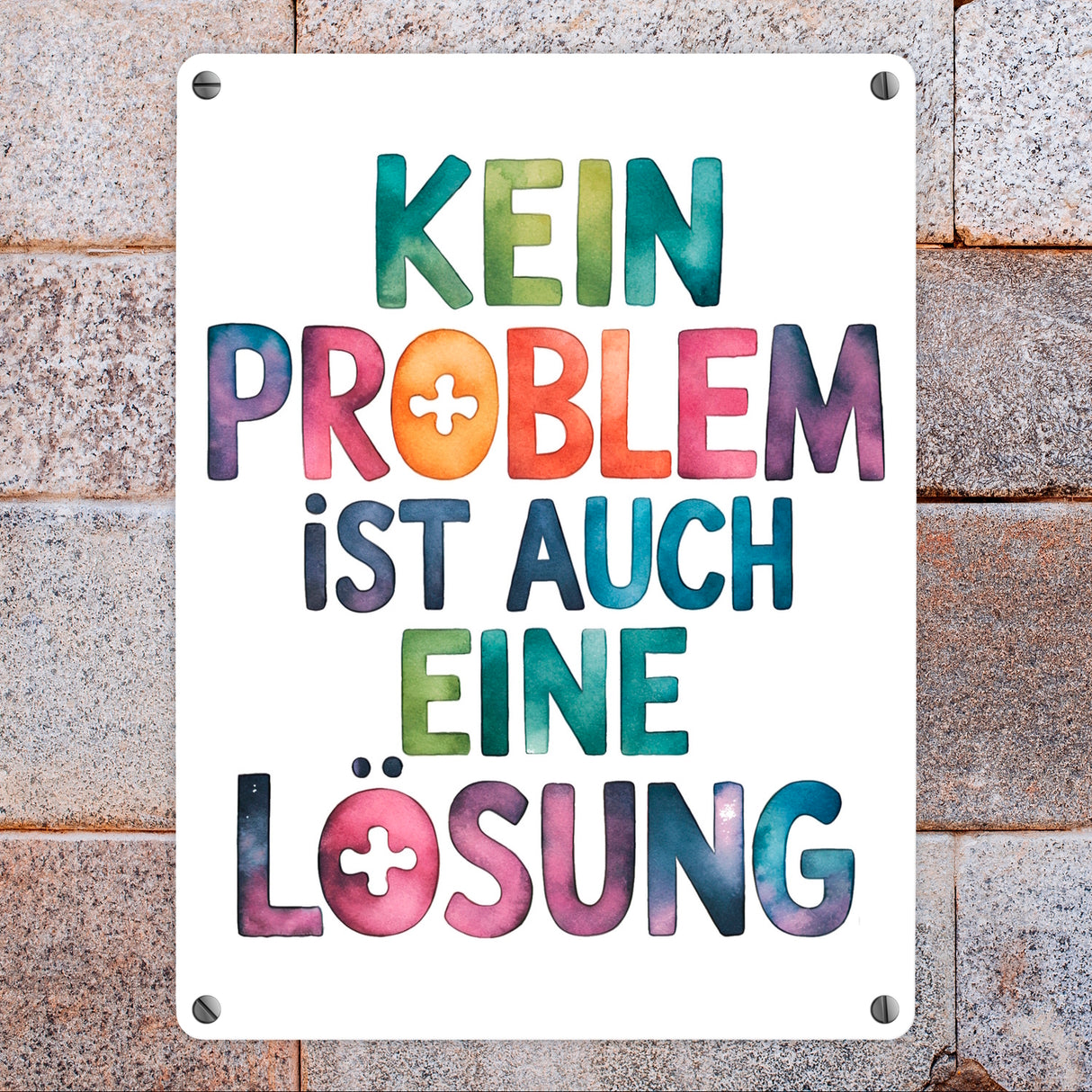 - Dieses Metallschild ist ein echter Hingucker! Es zeigt in seiner typografischen Darstellung in Aquarell-Pastellfarben den humorvollen deutschen Spruch "Kein Problem ist auch eine Lösung". Liebevoll gestaltet mit verspielten Buchstaben und einem Puzzleteil, das die Lösung symbolisiert, strahlt es in variierenden Farbtönen von Grün bis Lila.