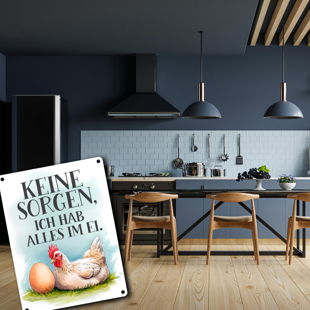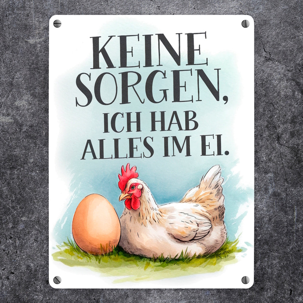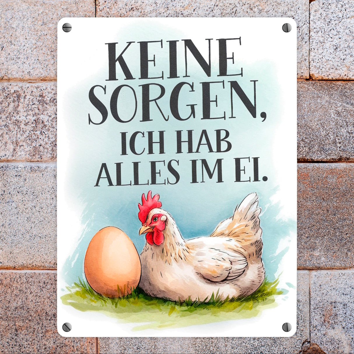 - Dieses Metallschild kombiniert Humor und Charme mit einem verspielten Design: Ein entspanntes Huhn sitzt auf grünem Gras neben einem großen Ei. Der lustige Spruch "KEINE SORGEN, ICH HAB ALLES IM EI" in großen schwarzen Buchstaben bringt Ruhe und Heiterkeit in Küche oder Garten. Einfarbige Aquarell-Pastellfarben vervollständigen das Design.