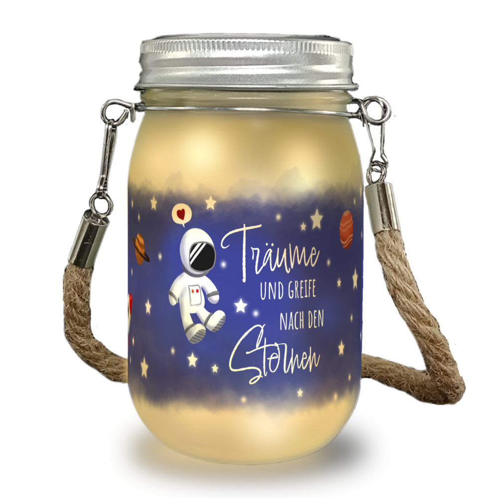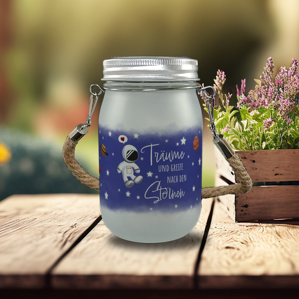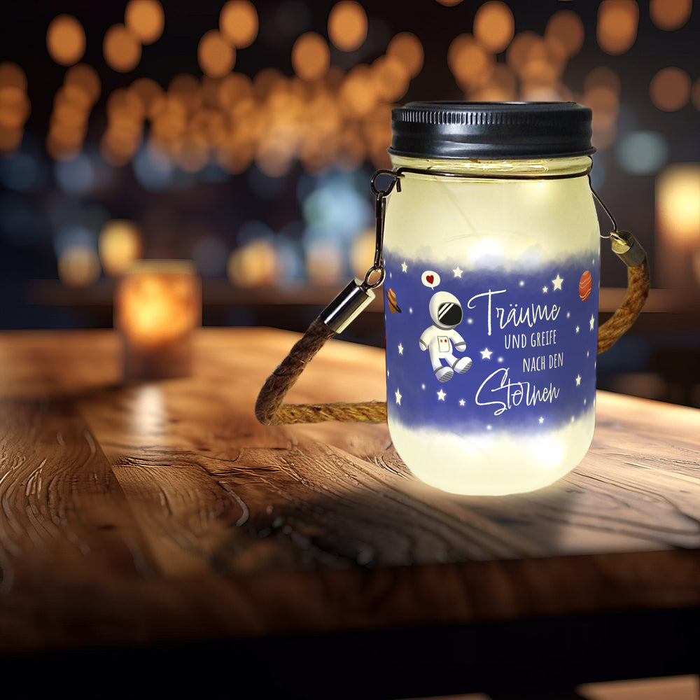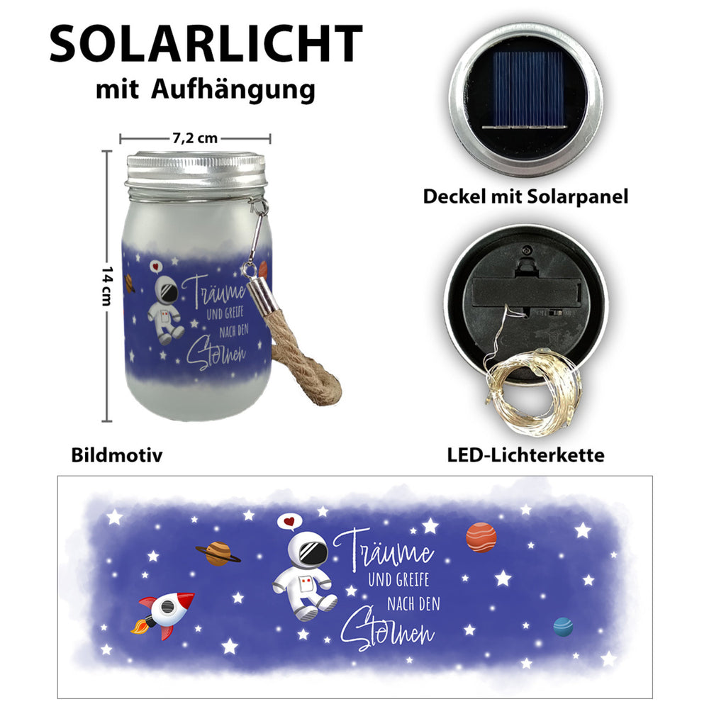 - Das Solarlicht ist ein niedliches Deko-Objekt, das mit seinem Astronauten-Motiv und Sternenbildern eine magische Atmosphäre schafft. Es hat die Form eines Einmachglases mit Solar-Deckel und einem nostalgischen Strickhenkel. Ideal für Kinderzimmer, um nächtliche Abenteuer zu beleuchten und Weltraumträume zu wecken.
