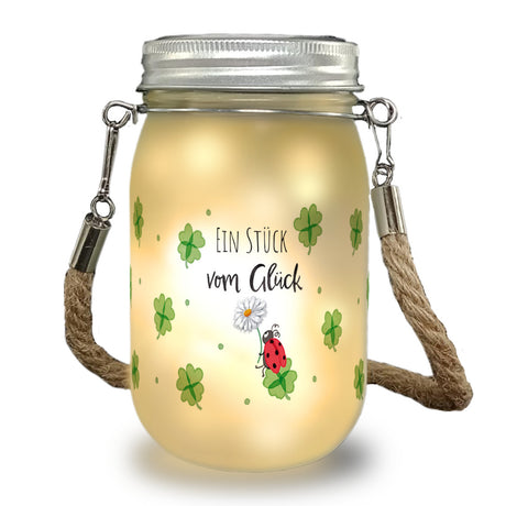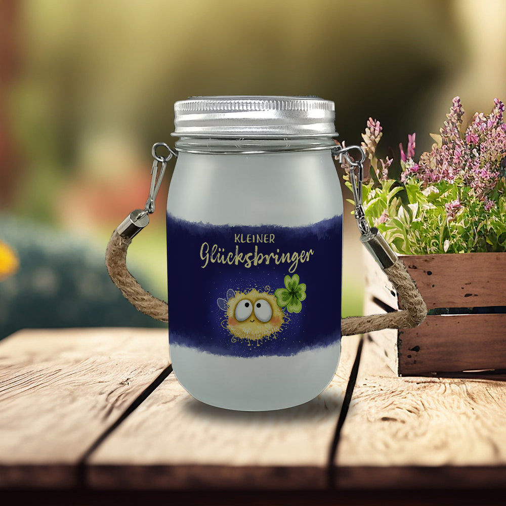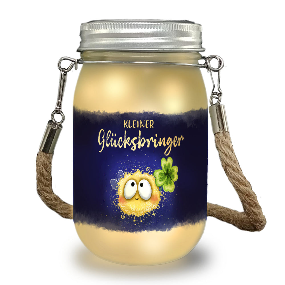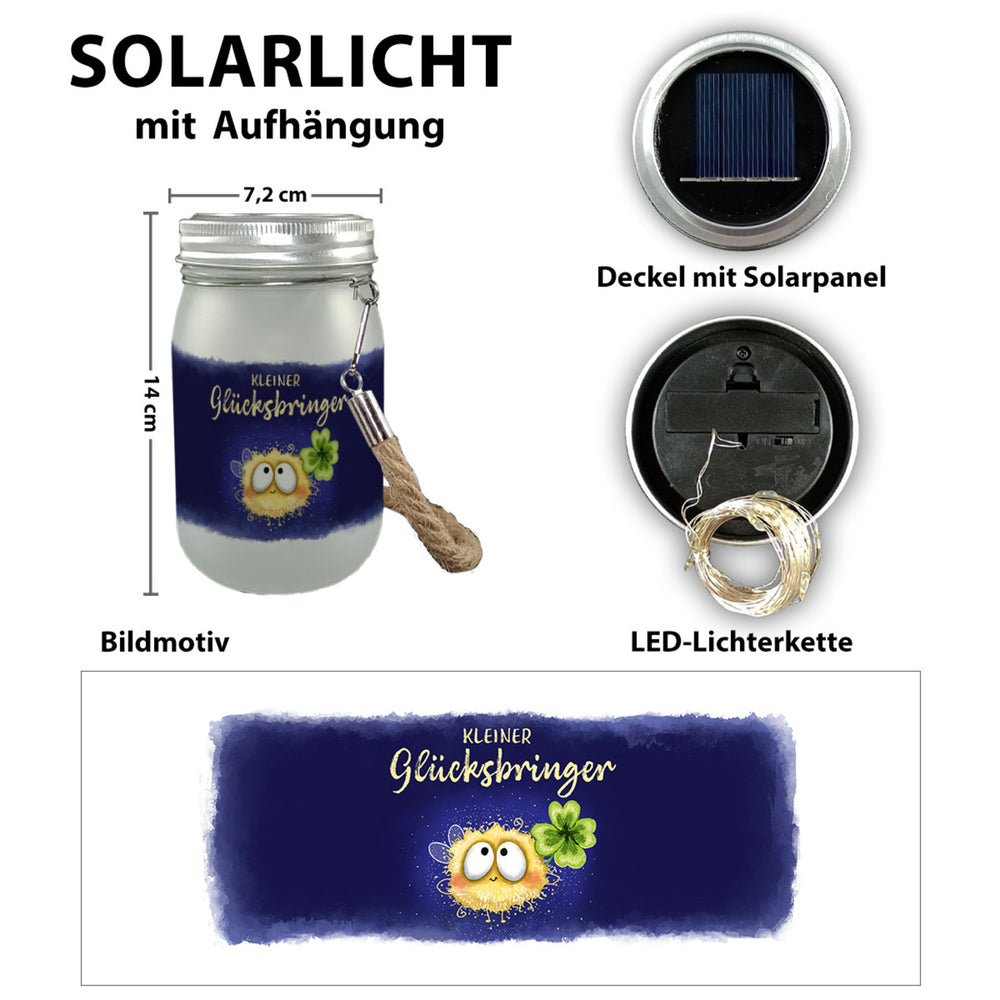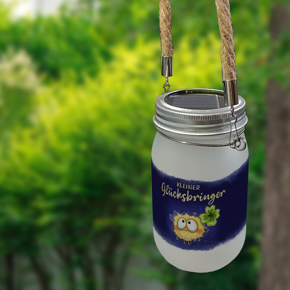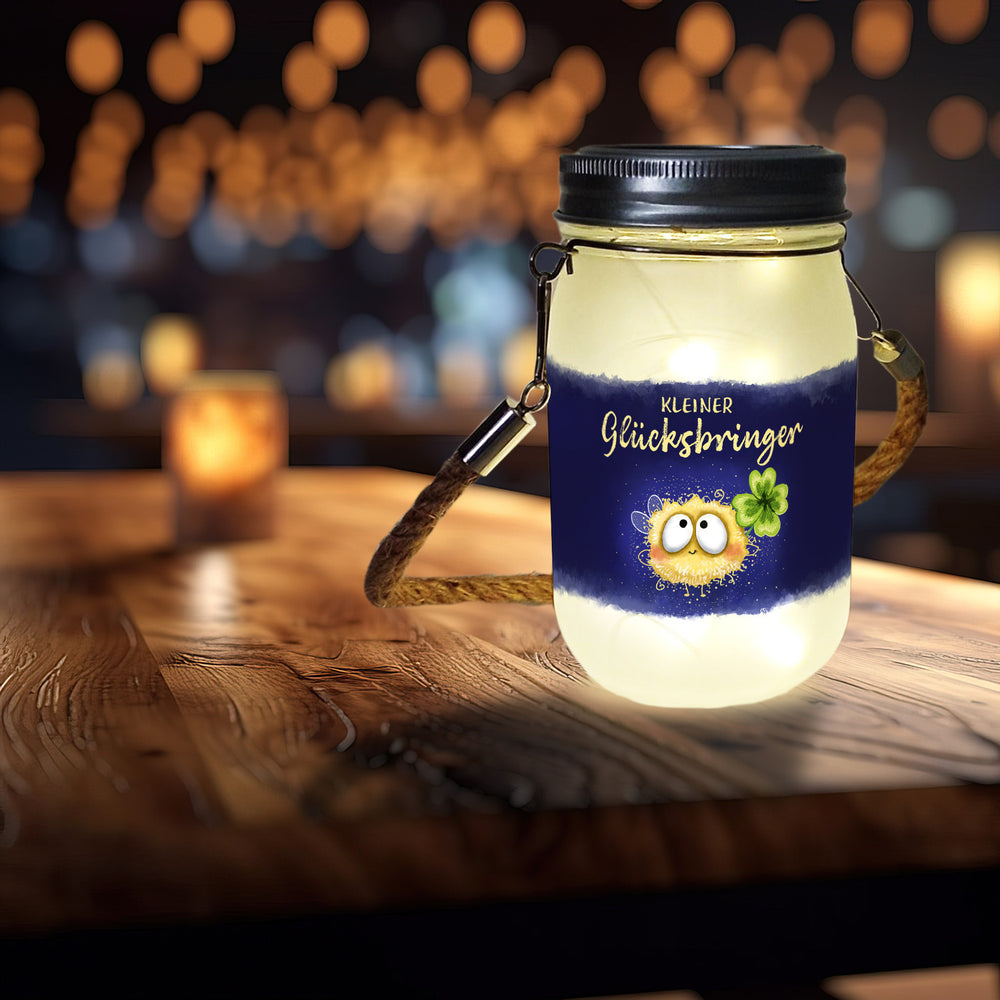 - Das Solarlicht ist eine charmante Dekolampe im Design eines Einmachglases. Der Deckel beinhaltet eine Solarzelle und der Henkel ist aus nostalgischem Strick. Im Inneren schwebt ein pummeliges Glühwürmchen mit Kleeblatt - ein wahrer Hingucker! Ob auf der Terrasse oder als Geburtstagsdeko, dieses Licht bringt Glück und zaubert ein Lächeln ins Gesicht.