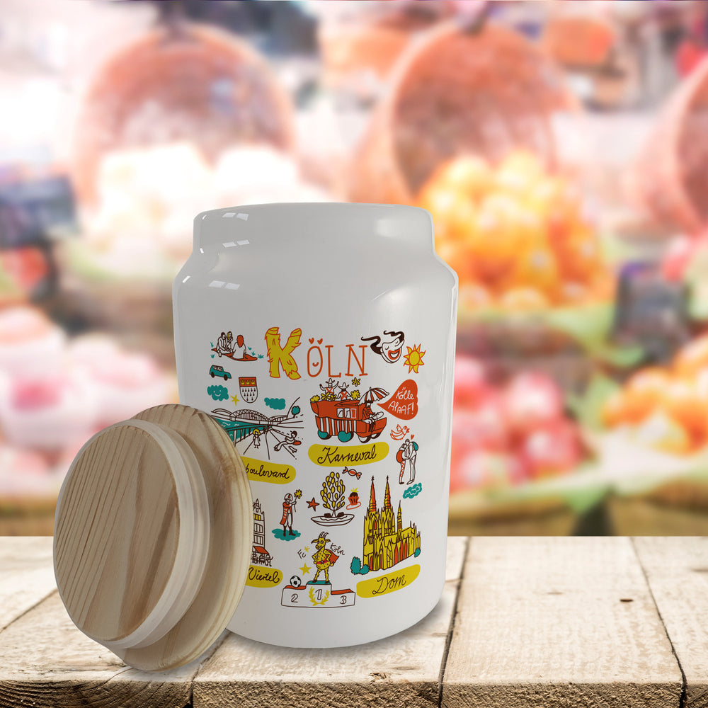 Das auffällige Köln Wimmelbild ziert diese farbenfrohe Keksdose und zeigt ikonische Wahrzeichen wie den Kölner Dom, das Schokoladenmuseum und den Rhein. Verspielte Details wie ein küssendes Paar und eine Theatermaske fügen humorvolle Elemente hinzu, die j Hinweise: Material: Keramik und Holz / Volumen 650 ml