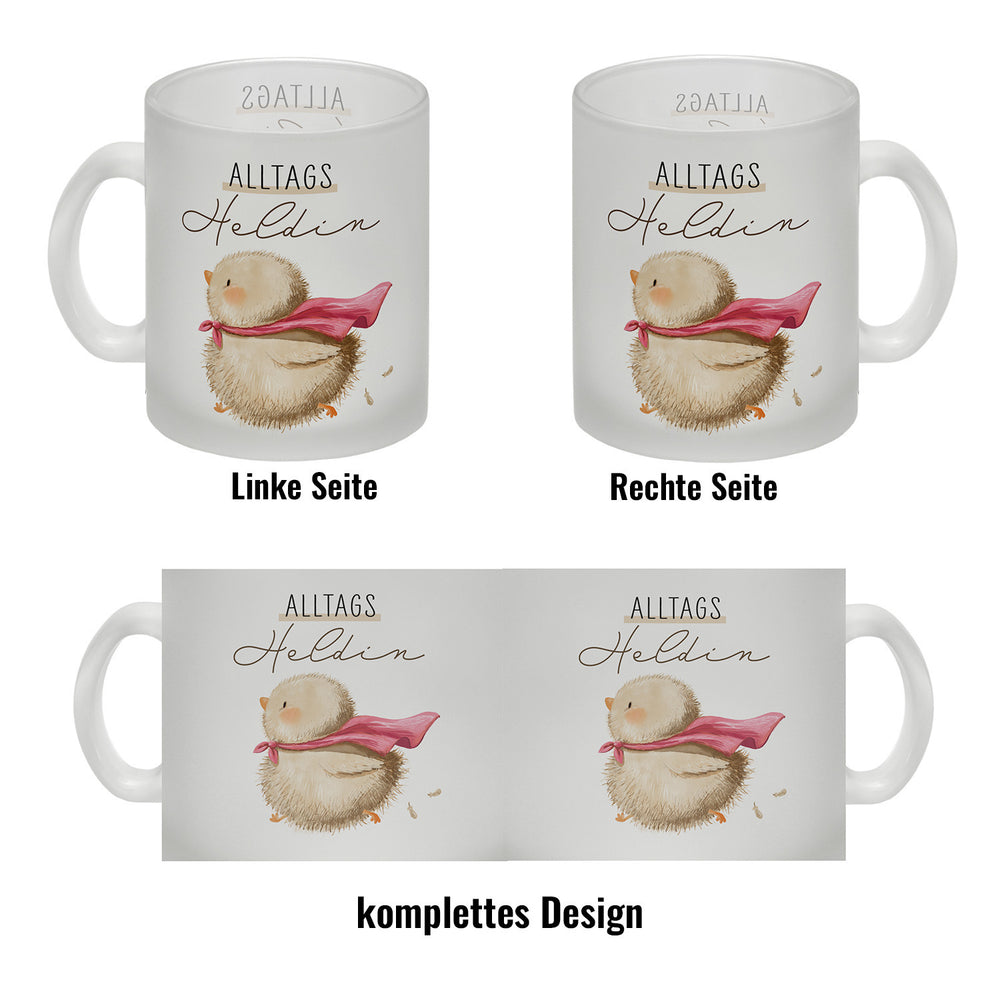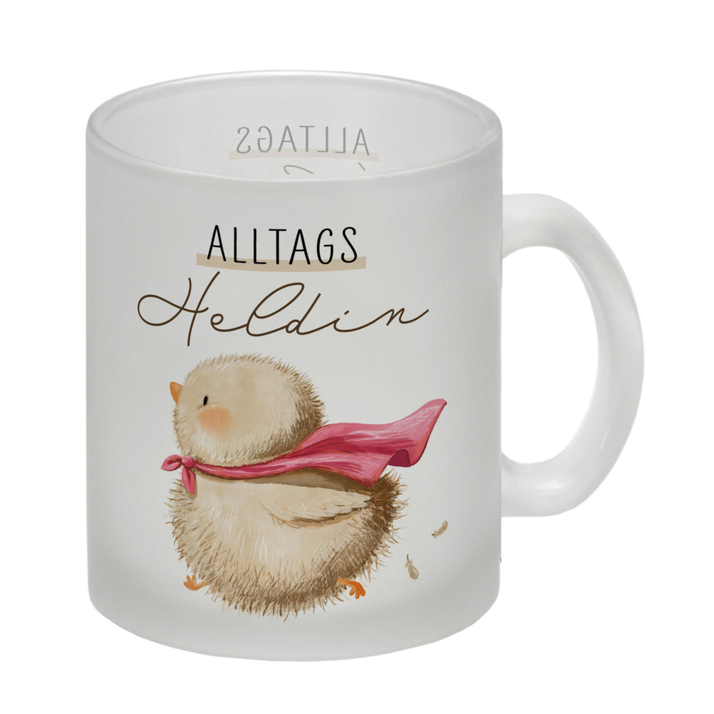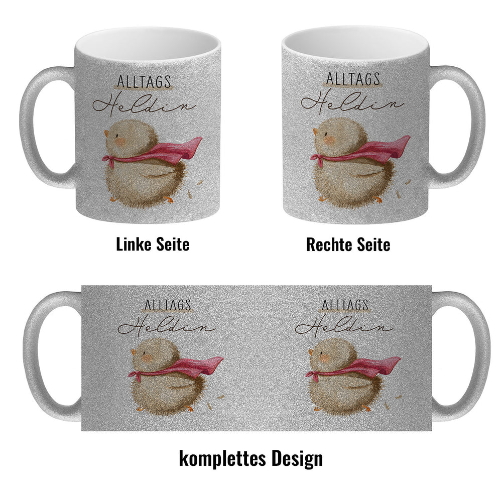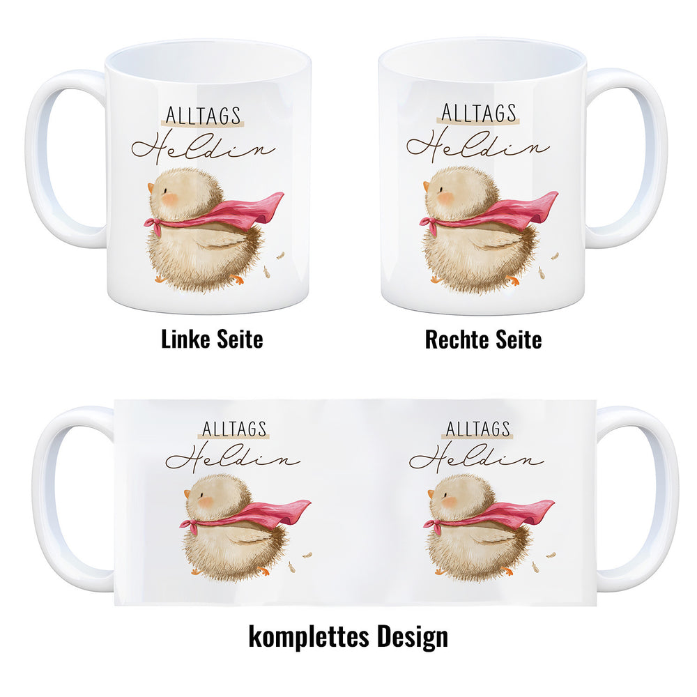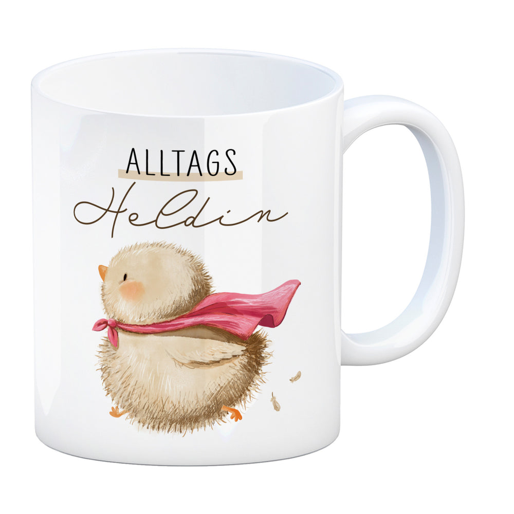 - 1x Küken Kaffeebecher mit Spruch Alltagsheldin in der gewählten Ausführung