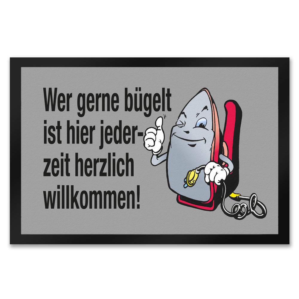Lächelndes Bügeleisen Fußmatte in 35x50 cm mit Spruch: Freunde des Bügelns willkommen!