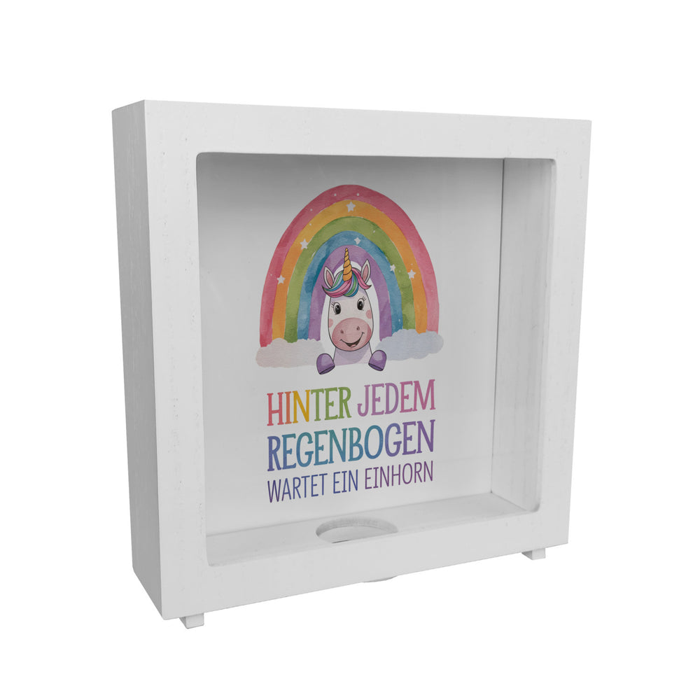 - 1x Lächelndes Einhorn Spardose Hinter jedem Regenbogen in der gewählten Ausführung