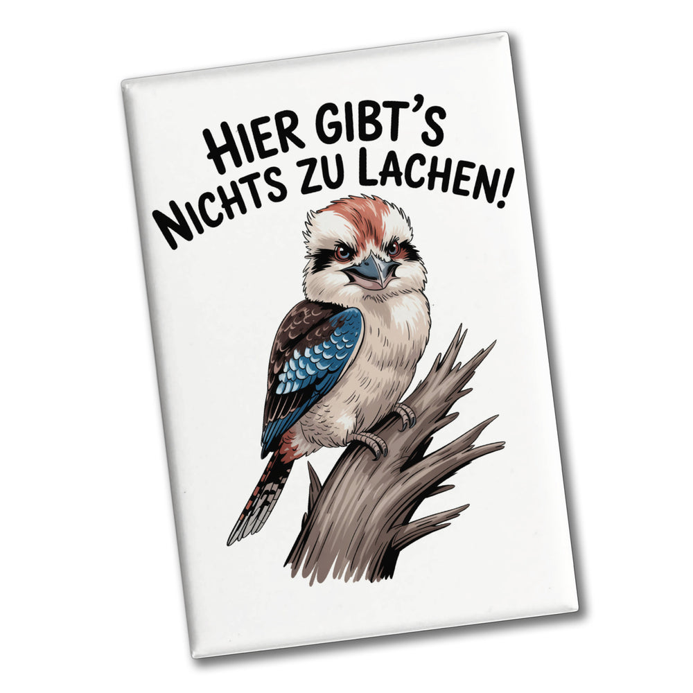 Der Kühlschrankmagnet zeigt den charmant schelmischen Jägerlieste, bekannt als Lachender Hans. Sein blau-braunes Gefieder und der freche Blick bezaubern jeden Betrachter. Der humorvolle Spruch "Hier gibt's nichts zu lachen!" in verspielter Schrift Hinweise: Größe: ca. 8x5,5 cm