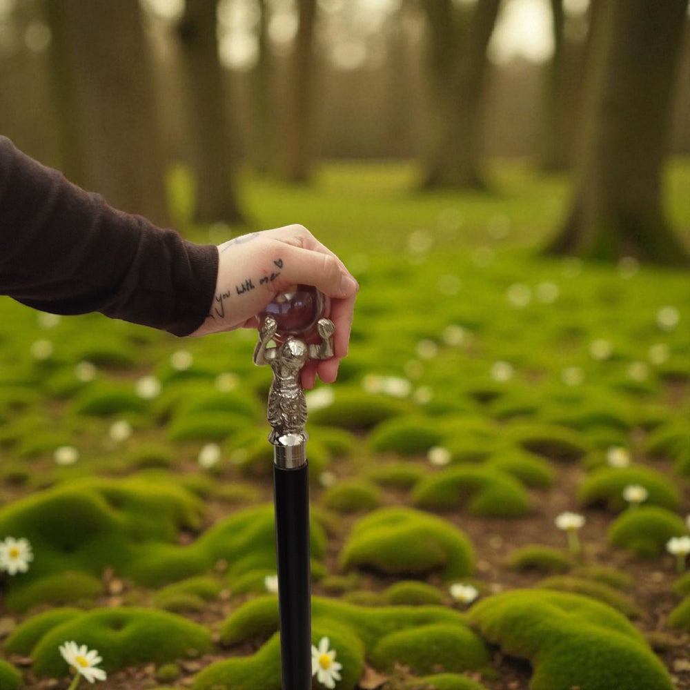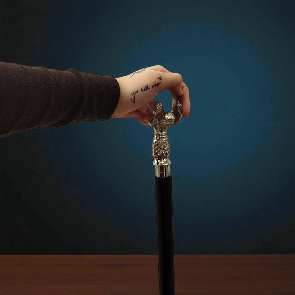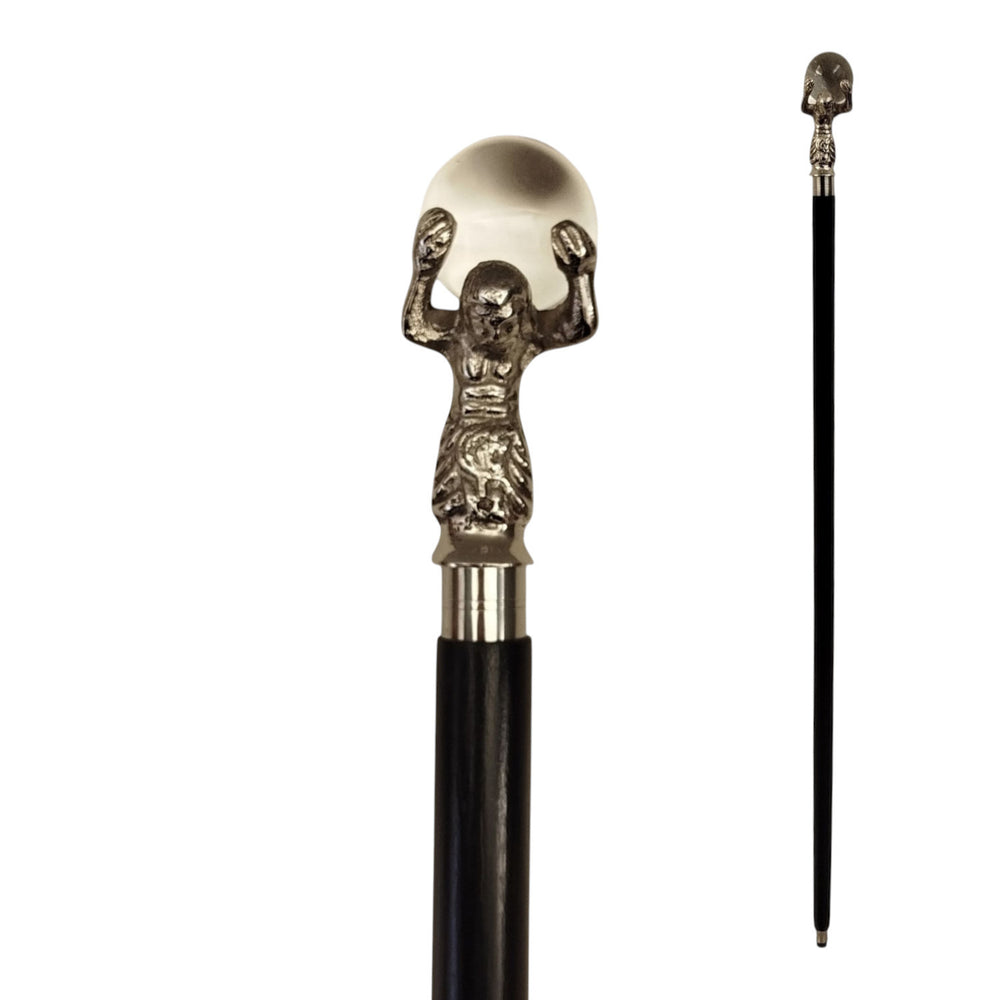 - Dieser Gehstock aus hochwertigem schwarzem Holz zieht mit seinem silbernen Metallgriff alle Blicke auf sich. Der Griff zeigt einen Mann, der eine gläserne Kugel balanciert - ein Kunstwerk, das man abschrauben kann! Mit einem weichen Gummipuffer ausgestattet, schützt er selbst die empfindlichsten Böden.