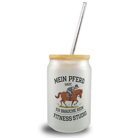 Mein Pferd ist mein Fitnessstudio Trinkglas mit Bambusdeckel