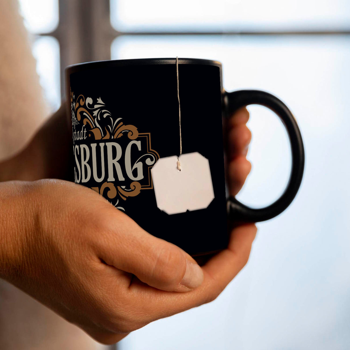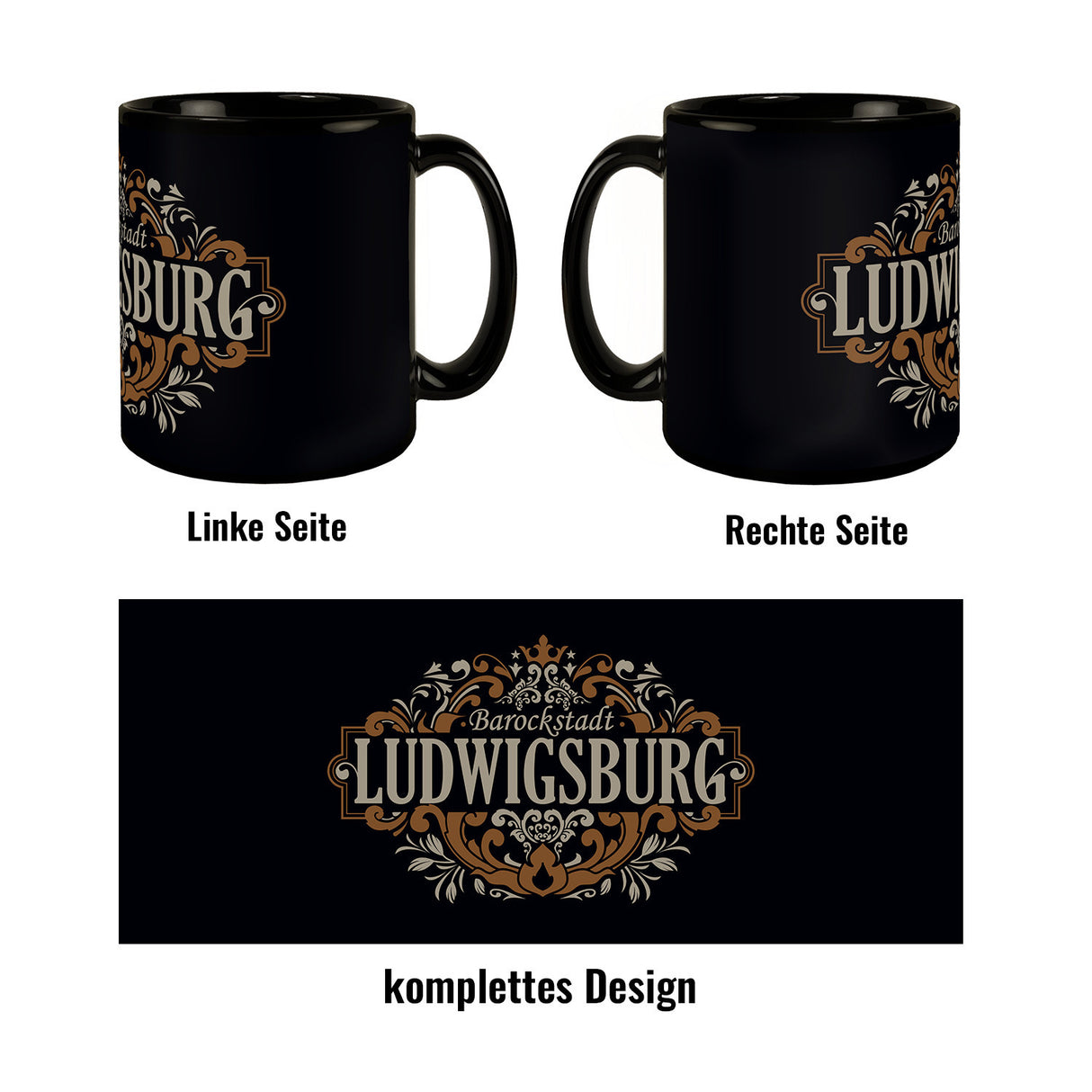- Diese stilvolle schwarze Kaffeetasse präsentiert ein edles Vintage-Emblem der Barockstadt Ludwigsburg. Mit kunstvollen Schnörkeln und goldenen Verzierungen zieht sie alle Blicke auf sich. Der goldene Schriftzug "Ludwigsburg" thront elegant in der Mitte. Ein wahrhaft königlicher Begleiter für Ihren Kaffee oder Tee!