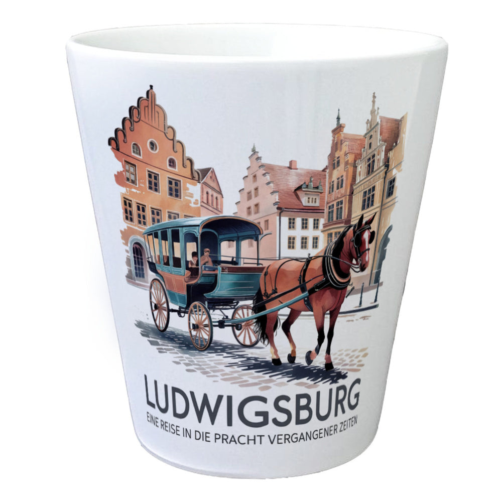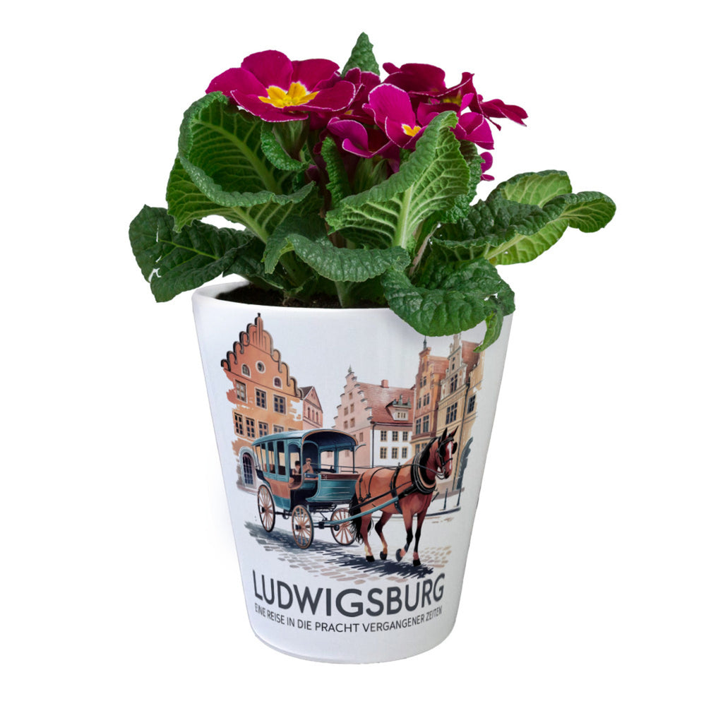Der Blumentopf zeigt eine farbenfrohe Aquarellszene einer Pferdekutsche auf Kopfsteinpflaster. Das nostalgische Design auf weißem Hintergrund strahlt altehrwürdige Ludwigsburger Atmosphäre aus. Mit prächtigen Gebäuden und strahlendem Blau der Kutsche fäng Hinweise: Material: Keramik / Höhe: ca. 10 cm, Durchmesser oben: ca. 9cm / Mit Bodenloch zur Vermeidung von Staunässe.
