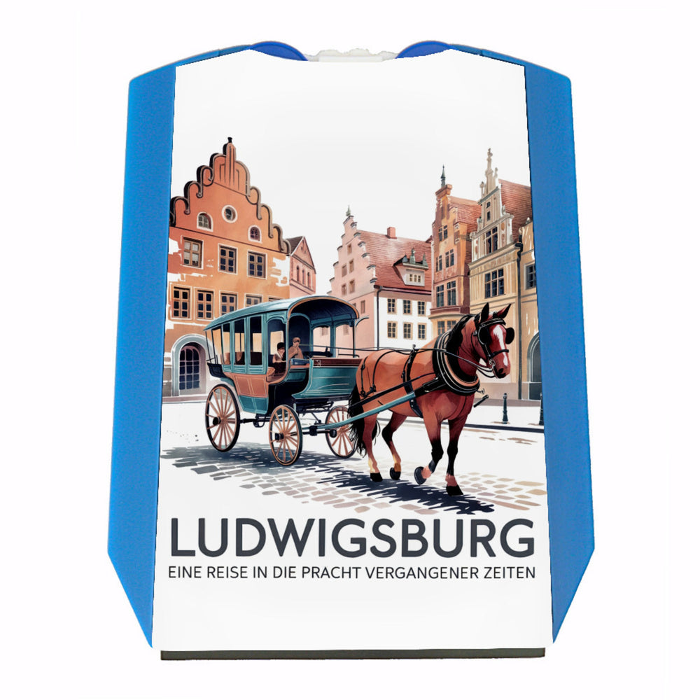 - Die Ludwigsburg Reise Parkscheibe ist ein charmantes Kunstwerk mit einem nostalgischen Pferdekutschen-Motiv. Auf einem weißen Hintergrund leuchten typografische Aquarell-Pastellfarben. Der Satz "Ludwigsburg - Eine Reise in die Pracht vergangener Zeiten" ziert die Szene. Die Parkscheibe fängt die Ruhe und den Charme einer historischen Stadt mit ihren kunstvollen Gebäuden ein.