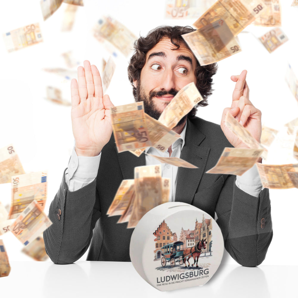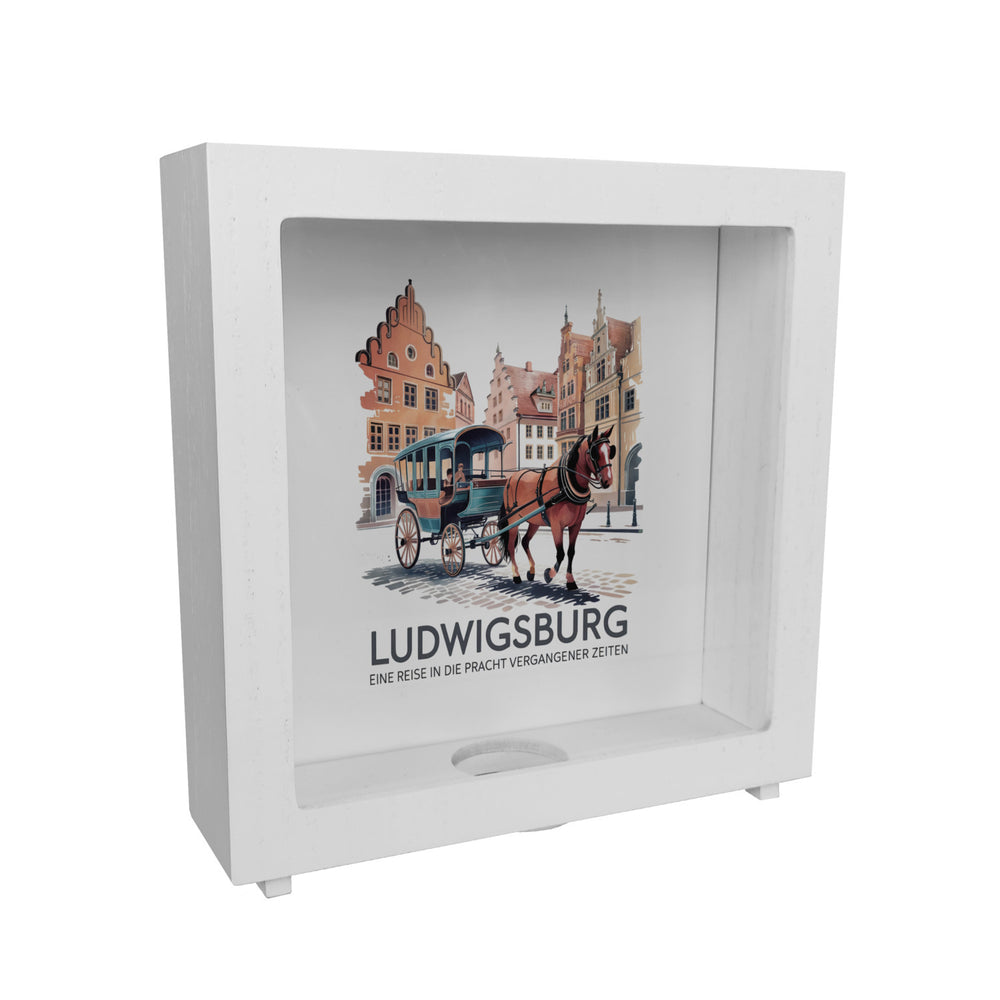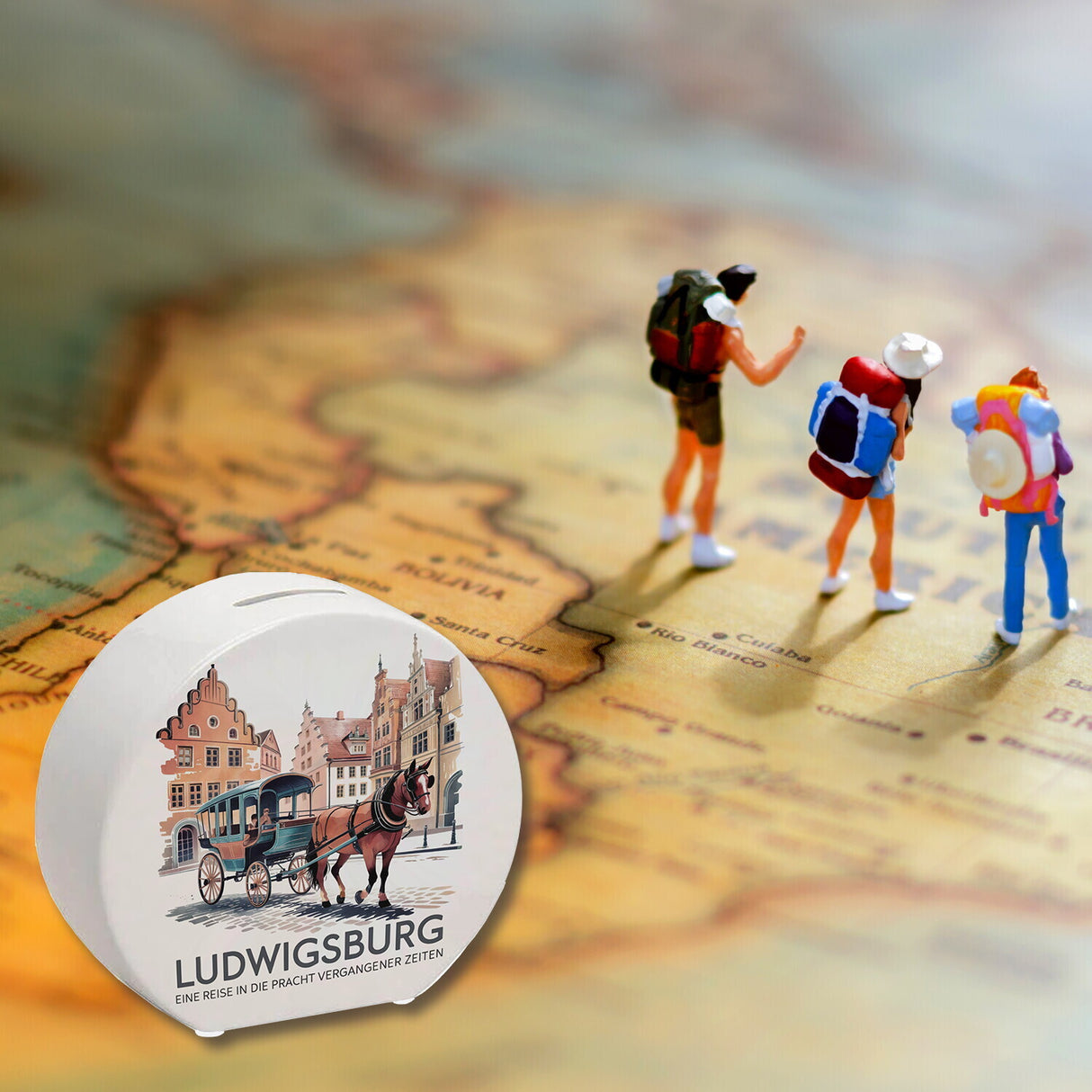 - Tauchen Sie ein in die vergangene Zeit mit unserer Ludwigsburg Reise Spardose! Diese nostalgische Sparbüchse zeigt eine Pferdekutsche auf Kopfsteinpflaster vor kunstvollen Gebäuden in malerischen Pastellfarben. Typografische Aquarellkunst schmückt den weißen Hintergrund, während "Ludwigsburg - Eine Reise in die Pracht vergangener Zeiten" in großen Buchstaben prangt.