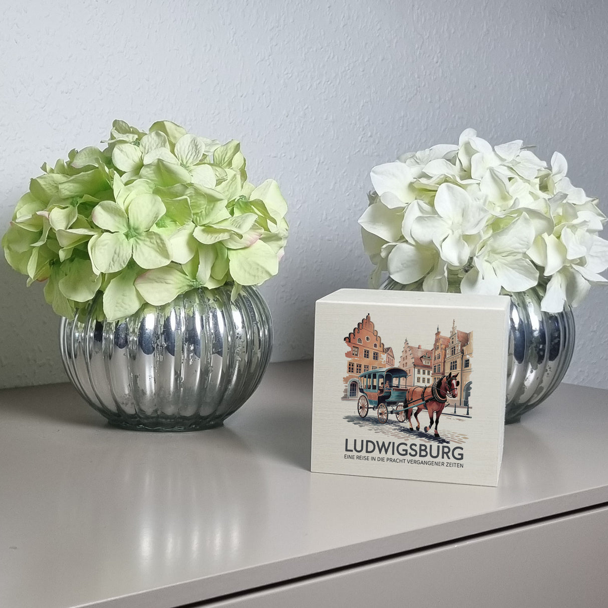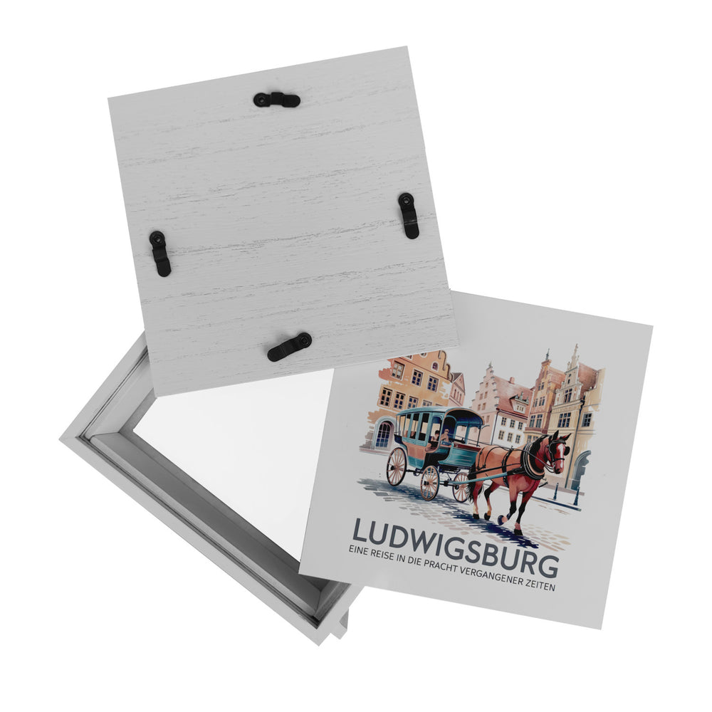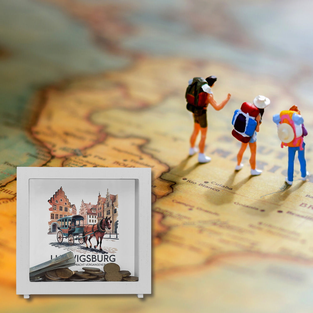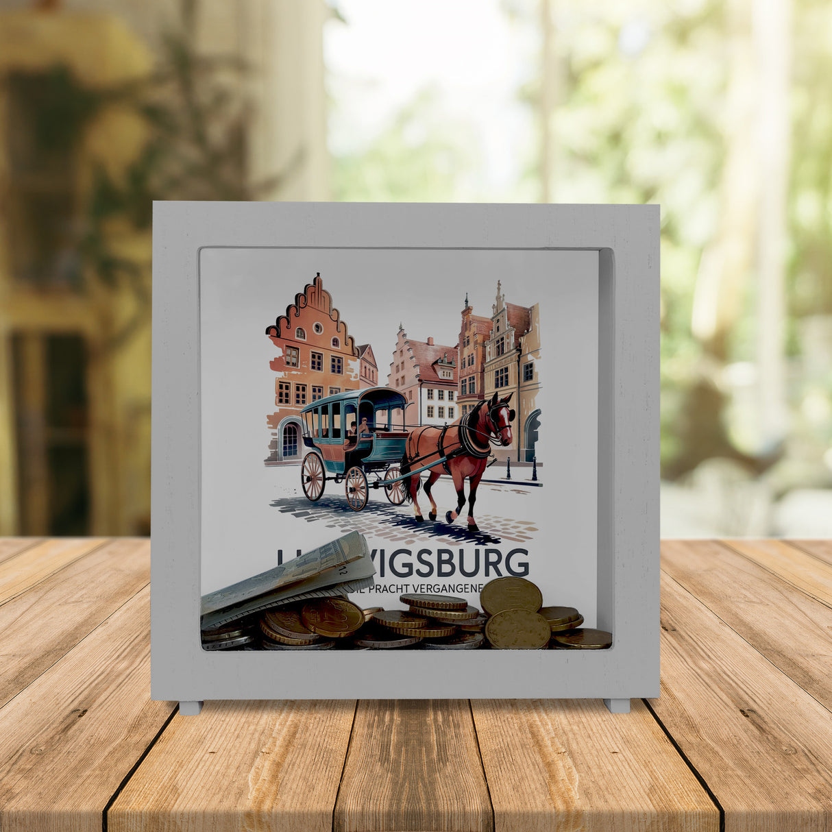 - Tauchen Sie ein in die vergangene Zeit mit unserer Ludwigsburg Reise Spardose! Diese nostalgische Sparbüchse zeigt eine Pferdekutsche auf Kopfsteinpflaster vor kunstvollen Gebäuden in malerischen Pastellfarben. Typografische Aquarellkunst schmückt den weißen Hintergrund, während "Ludwigsburg - Eine Reise in die Pracht vergangener Zeiten" in großen Buchstaben prangt.